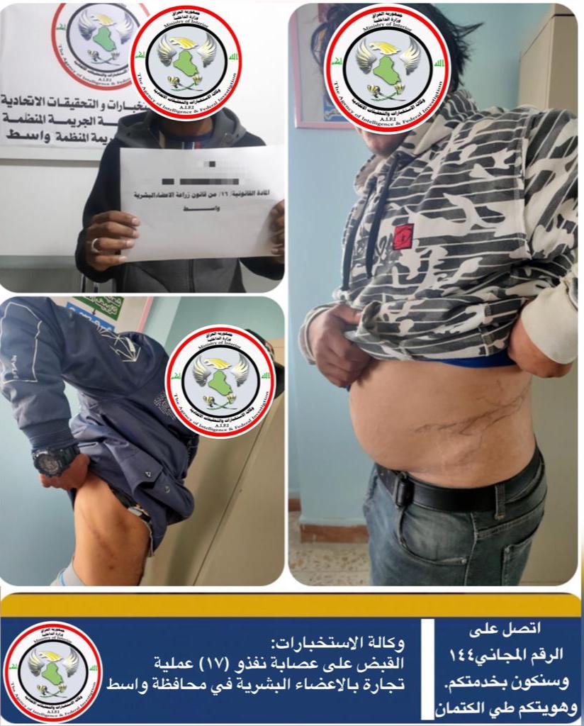 وقالت الوكالة، انه “من خلال ورود معلومات استخباراتية عن وجود احدى عصابات الجريمة المنظمة من المتاجرين بالاعضاء البشرية، تم تشكيل فريق عمل مختص من مفارز وكالة الاستخبارات المتمثلة بمديرية استخبارات الجريمة المنظمة بمحافظة واسط في وزارة الداخلية”.