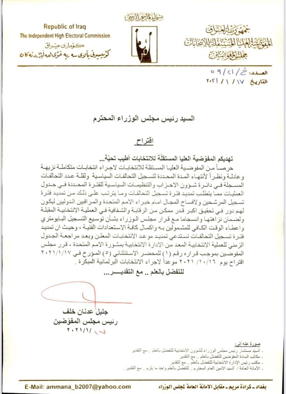 وتابعت المفوضية، “حيث تمديد فترة تسجيل التحالفات السياسية وتسجيل الناخبين البايومترية تستدعي تمديد موعد الانتخابات البرلمانية ، وحرصاً من المفوضية العليا المستقلة للانتخابات في اجراء انتخابات نزيهة وعادلة ومتكاملة، عليه قرر مجلس المفوضين اقتراح موعد لاجراء الانتخابات البرلمانية المبكرة في ٢٠٢١/١٠/١٦”.