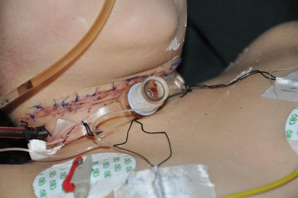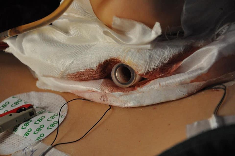 واضاف البيان، إنه ” تم إستلام الطفلة المُصابة أولاً من قبل فريق قسم الطوارئ والقيام بعمل الإسعافات الأولية ، المُتمثلة بالمغذيات الوريدية ، وقناني الدم ، ووضع إنبوب القصبة الهوائية لحماية المجرى التنفسي، حيث كانت الطفلة تُصارع المُوت ، وبحالة صدمةٍ وعائية وفاقدة للوعي تماماً ، ونسبة الأُوكسجين لديها 35 ٪ ، حيث تم إعطاء التخدير التام لها في داخل ردهة الطوارئ ، وغسل منطقة الإصابة وتعقيمها ، كون الطفلة ، كانت تُعاني من قطع في القصبة الهوائية والمريء”.