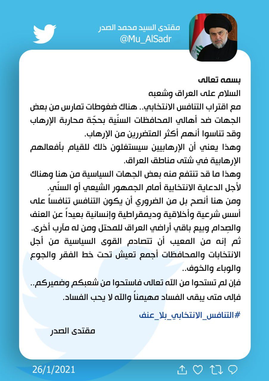 الاخبار العاجلةالصدر: هناك ضغوطات من بعض الجهات تمارس ضد اهالي المحافظات السنية بحجة محاربة الارهاب قبل 5 سنوات 2 مشاهدات شارك قد يهمك أيضا أمن من منفذ ربيعة.. قوات الحدود: حدودنا مع سوريا آمنة ومستقرة قبل 6 دقائق 2 مشاهدات رياضة قرعة مثيرة ربع نهائي كأس ملك إسبانيا: برشلونة يلتقي ألباسيتي قبل 10 دقائق 4 مشاهدات عربي ودولي طهران تدرس رفع حجب الإنترنت والتلفزيون الحكومي يتعرض لاختراق قبل 18 دقيقة 3 مشاهدات محليات خلل فني بخطوط الغاز يتسبب بانقطاع الكهرباء في محافظات أربيل ودهوك والسليمانية قبل 45 دقيقة 5 مشاهدات سياسة وزير الداخلية: لا خروقات أمنية على الحدود مع سوريا ولم نرصد عمليات تسلل قبل 45 دقيقة 6 مشاهدات