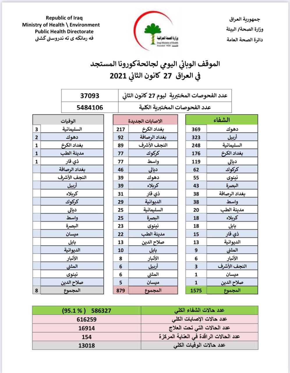الاخبار العاجلةمحلياتالصحة تعلن تسجيل 879 اصابة جديدة بفيروس كورونا في عموم العراق قبل 5 سنوات شارك قد يهمك أيضا أقتصاد صندوق النقد الدولي: متوسط سعر النفط في 2026 عند 62.13 دولار للبرميل قبل 18 دقيقة 4 مشاهدات أمن شرطة الكرخ تعتقل شخصين حاولا اضرام النار في منزل بمنطقة الاعلام جنوبي بغداد قبل 20 دقيقة 5 مشاهدات سياسة العراق يعزي إسبانيا بضحايا حادثة اصطدام قطارين جنوبي البلاد قبل 22 دقيقة 5 مشاهدات عربي ودولي “قسد”: خروج سجن الشدادي عن السيطرة بعد هجمات مكثفة من الجيش السوري قبل 47 دقيقة 10 مشاهدات أمن مشاجرة عائلية تنتهي بمقتل سيدة واصابة 4 اشخاص شرقي بغداد قبل ساعة واحدة 8 مشاهدات