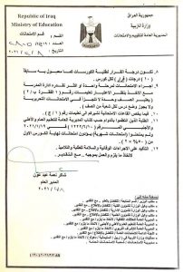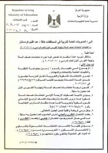 وجهت وزارة التربية، اليوم الاثنين، المديريات العامة في بغداد والمحافظات بالالتزام بالتعليمات الخاصة بأمتحانات نصف السنة ونهاية الكورس الأول للعام الدراسي 2020 – 2021.