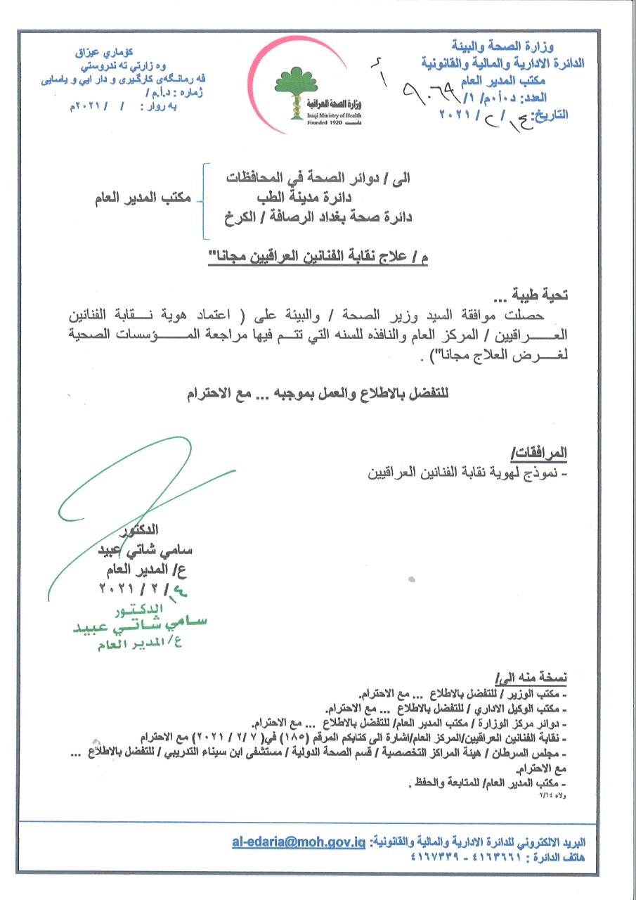محلياتبالوثيقة .. وزير الصحة والبيئة يوجه بعلاج الفنانين مجاناً قبل 5 سنوات 4 مشاهدات شارك قد يهمك أيضا عربي ودولي وفاة رفعت الأسد عم رئيس النظام السوري السابق بشار قبل 27 دقيقة 7 مشاهدات الاخبار العاجلة أردوغان يطالب “قسد” بحل نفسها وإلقاء السلاح “فورا” قبل 34 دقيقة 5 مشاهدات رياضة بجملة قاطعة.. فينيسيوس يحسم إمكانية رحيله عن ريال مدريد قبل 55 دقيقة 7 مشاهدات محليات فرق الدفاع المدني تفرض سيطرتها على حريق اندلع داخل مخزن للمواد الإنشائية في النجف قبل ساعتين 8 مشاهدات أمن الإطاحة بإرهابي خطير شغل مناصب لدى داعش في كركوك قبل ساعتين 9 مشاهدات