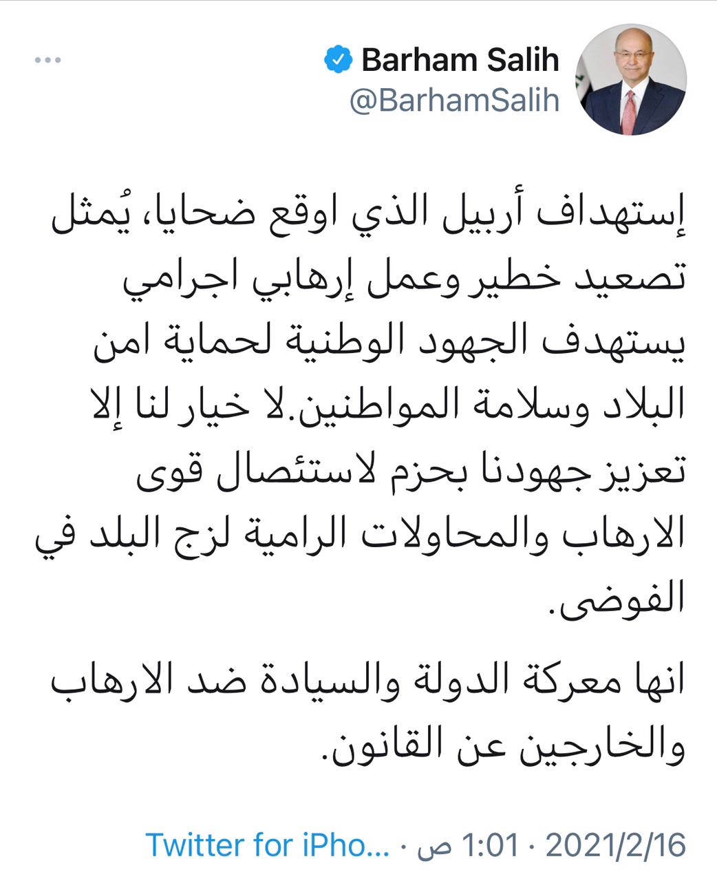 الاخبار العاجلةرئيس الجمهورية: إستهداف أربيل يُمثل تصعيد خطير وعمل إرهابي يستهدف جهود حماية امن البلاد قبل 5 سنوات 5 مشاهدات شارك قد يهمك أيضا عربي ودولي الخارجية السورية: ملتزمون بضمان نجاح العملية الأميركية لنقل سجناء “داعش” الى العراق قبل 48 دقيقة 6 مشاهدات أمن الهجرة: أقل من 5000 عراقي ما زالوا يتواجدون في مخيم الهول قبل 57 دقيقة 7 مشاهدات أمن القيادة الوسطى الأمريكية: نتوقع وصول عدد معتقلي داعش الذين سينقلون من سوريا الى العراق لـ7000 قبل ساعة واحدة 22 مشاهدات الاخبار العاجلة القيادة الوسطى الأمريكية: بدأنا مهمة لنقل معتقلي داعش من سوريا إلى العراق قبل ساعة واحدة 14 مشاهدات عربي ودولي “قسد” تنفي اتهامات وزير الدفاع السوري بشأن انفجار معبر اليعربية وخرق وقف إطلاق النار قبل ساعتين 8 مشاهدات