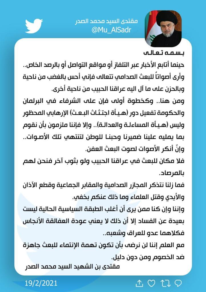 الاخبار العاجلةالصدر يدعو الحكومة والبرلمان لتفعيل هيئة اجتثاث البعث قبل 5 سنوات 2 مشاهدات شارك قد يهمك أيضا عربي ودولي “وول ستريت جورنال”: الولايات المتحدة تدرس انسحابًا عسكريًا كاملًا من سوريا قبل 6 ساعات 11 مشاهدات الحكم الرابع الزوراء يغلق الابواب بوجه الاندية وصراع المقدمة يشتد.. تفاصيل مثيرة في الحكم الرابع قبل 6 ساعات 8 مشاهدات سياسة المبعوث الامريكي لسوريا: إسهامات العراق في تعزيز الاستقرار بالمنطقة تعكس التزاماً بالأمن الجماعي قبل 7 ساعات 11 مشاهدات الاخبار العاجلة وزير الخارجية الأمريكي: العراق يقف في الخطوط الأمامية لمواجهة تهديد داعش قبل 7 ساعات 22 مشاهدات الاخبار العاجلة الخارجية الأمريكية: نرحب بمبادرة العراق لاحتجاز عناصر داعش في منشآت آمنة على أراضيه قبل 7 ساعات 19 مشاهدات