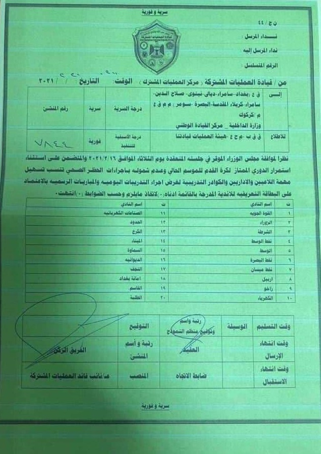 قراءة: العمليات المشتركة توجه باستثناء الاندية المشاركة بالدوري الممتاز من حظر التجوال