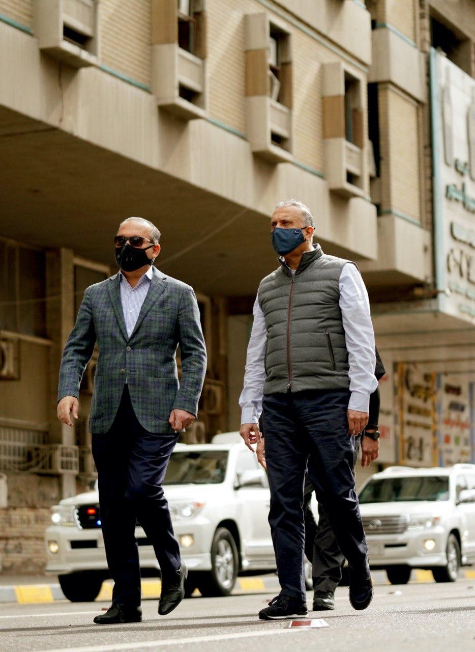 واجرى الكاظمي يرافقه امين بغداد علاء معن، جولة في ساحة الخلاني وشارع الرشيد وشارع الخلفاء والسوق العربي والشورجة، واطلع على جهود الامانة التي تقوم باعمال صيانة الشوارع واكسائها وحملات التنظيف.