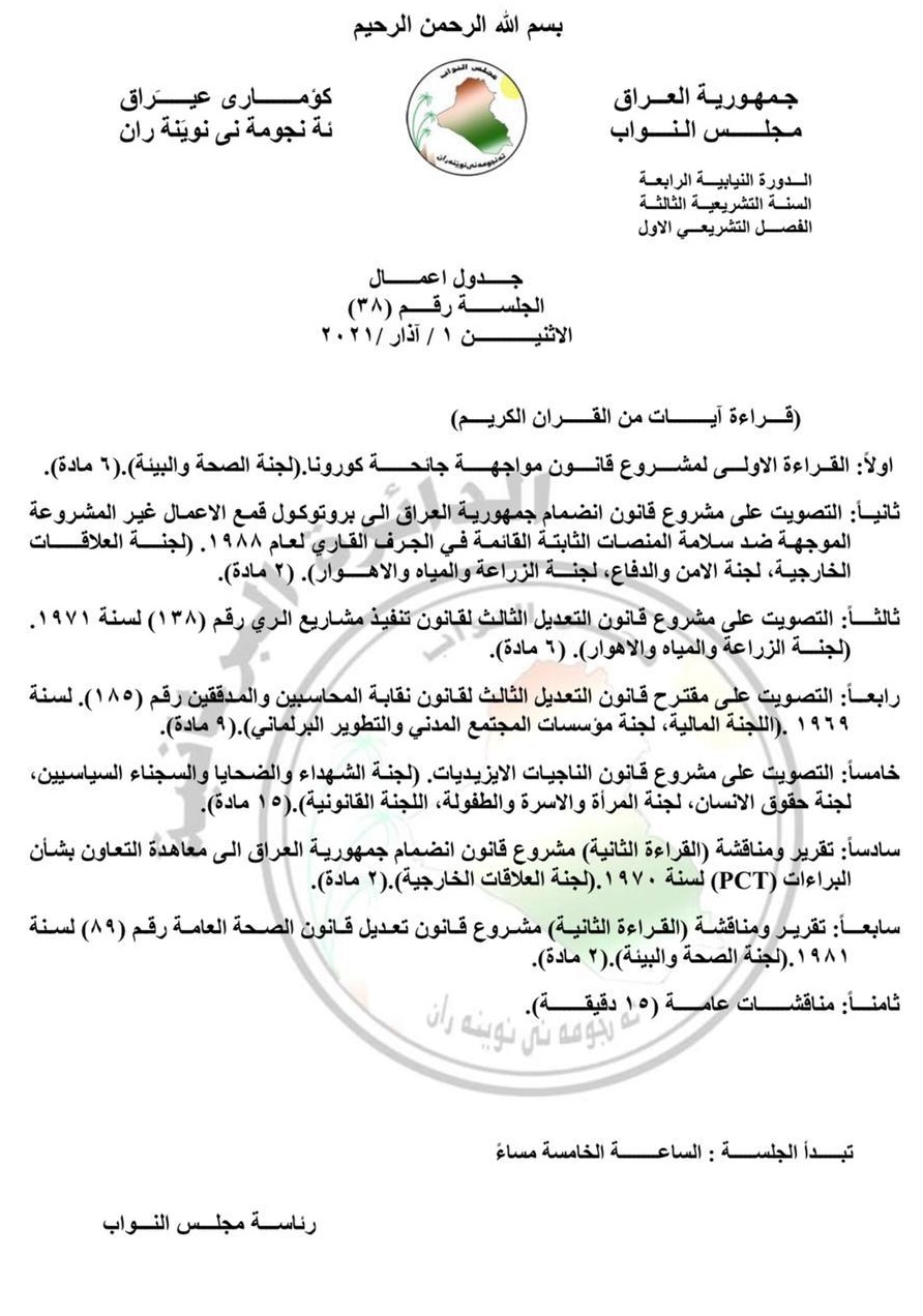 سياسةبالوثيقة .. جدول اعمال جلسة مجلس النواب ليوم الاثنين المقبل قبل 5 سنوات 4 مشاهدات شارك قد يهمك أيضا محليات النفط تعلن السيطرة على حريق اندلع في خزان بمستودع الفاو النفطي قبل ساعتين 7 مشاهدات عربي ودولي لإنهاء “الحكم الشيوعي”.. خطة أمريكية لفرض حصار نفطي على كوبا قبل ساعتين 7 مشاهدات عربي ودولي طهران: الحرب ستمتد إلى خارج حدود إيران إذا تعرضنا للهجوم قبل ساعتين 9 مشاهدات عربي ودولي الخطوط الجوية الفرنسية والسويسرية والكندية تلغي رحلاتها إلى إسرائيل قبل ساعتين 12 مشاهدات أمن السيد الصدر: نأمل ألا تكون الصراعات السياسية باباً لنسيان الواقع الأمني قبل 3 ساعات 10 مشاهدات