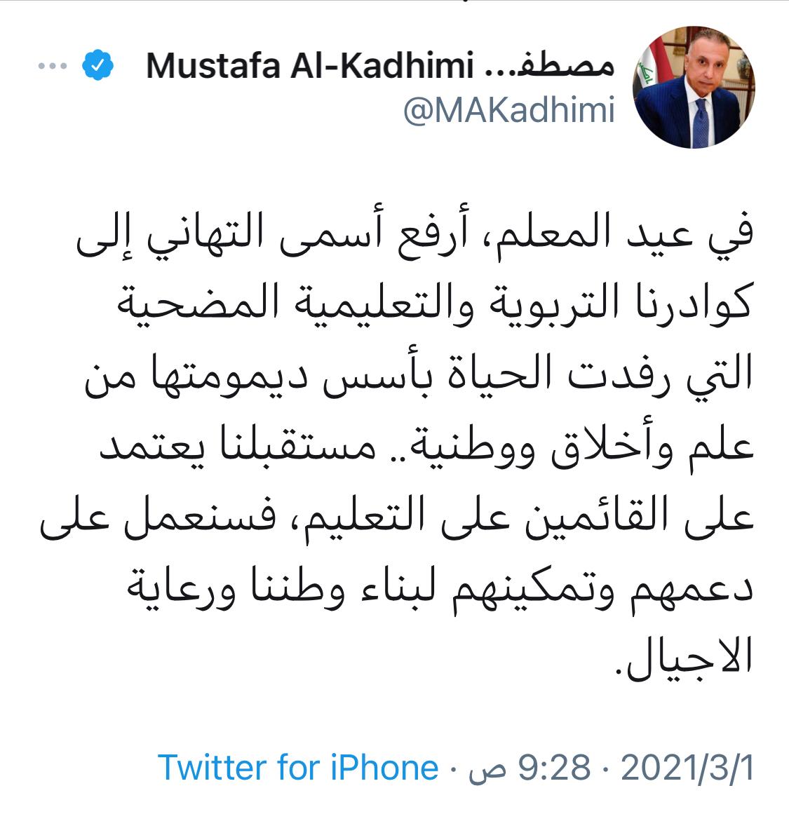 محلياتالكاظمي يهنئ الكوادر التربوية والتعليمية في عيد المعلم قبل 5 سنوات 3 مشاهدات شارك مصطفى الكاظمي قد يهمك أيضا عربي ودولي البيت الأبيض: أوروبا تدمر نفسها ببطء قبل 6 دقائق 2 مشاهدات عربي ودولي بالتزامن مع المفاوضات.. روسيا تهاجم أكبر مدينتين في أوكرانيا قبل 34 دقيقة 3 مشاهدات عربي ودولي إعلام عبري: الانتشار الأمريكي بالشرق الأوسط يبلغ أعلى مستوى منذ 8 أشهر قبل 42 دقيقة 3 مشاهدات محليات طقس العراق.. أمطار رعدية متفرقة وارتفاع درجات الحرارة خلال الأيام المقبلة قبل ساعة واحدة 6 مشاهدات محليات النفط تعلن السيطرة على حريق اندلع في خزان بمستودع الفاو النفطي قبل 10 ساعات 14 مشاهدات