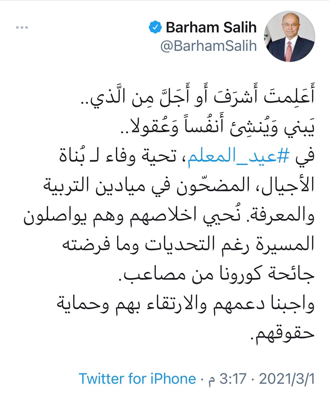 الاخبار العاجلةرئيس الجمهورية مهنئاً بعيد المعلم: واجبنا دعمهم والارتقاء بهم وحماية حقوقهم قبل 5 سنوات 5 مشاهدات شارك قد يهمك أيضا محليات التجارة تنفي حذف مواد من مفردات الحصة التموينية: تُوزَّع كاملة من دون أي نقص قبل 3 دقائق 2 مشاهدات عربي ودولي عاصفة ثلجية تدفع 18 ولاية أمريكية لإعلان الطوارئ وتلغي آلاف الرحلات قبل 11 دقيقة 2 مشاهدات أقتصاد استقرار أسعار الصرف في الأسواق المحلية: 148500 دينار مقابل كل 100 دولار قبل 20 دقيقة 4 مشاهدات سياسة وزير الخارجية: لا ينبغي للعراق أن يتحمل بمفرده الأعباء الأمنية والمالية لملف معتقلي داعش قبل 35 دقيقة 7 مشاهدات محليات “كلا كلا استقطاع”.. موظفو الجامعات العراقية يعلنون الاعتصام احتجاجاً على إلغاء مخصصات الخدمة الجامعية قبل 59 دقيقة 5 مشاهدات