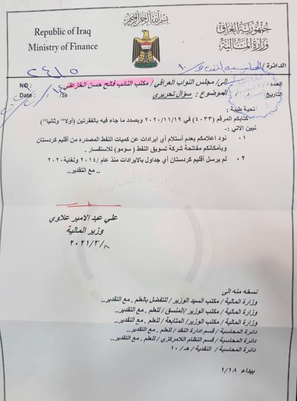 وجاءت الوثيقة رداً على سؤال تقدم به النائب فالح الخزعلي بشأن الإيرادات المالية لإقليم كردستان.