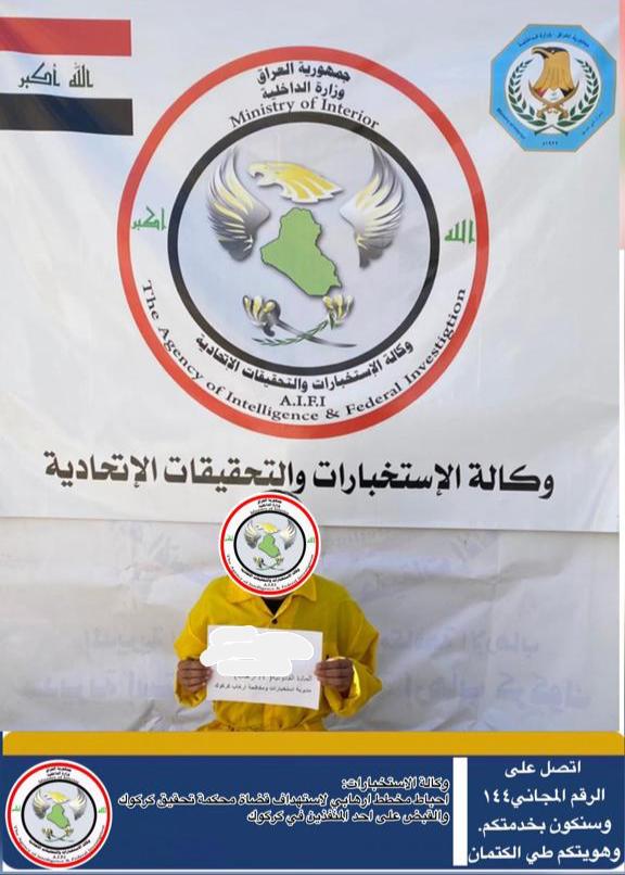 وقالت الوكالة، في بيان تلقته الرشيد، ان “مفارز وكالة الاستخبارات والتحقيقات الاتحادية في وزارة الداخلية، تمكنت من القاء القبض على احد الارهابيين في محافظة كركوك والمطلوب وفق احكام المادة (٤ ارهاب ) لانتمائه لعصابات داعش الارهابية”.