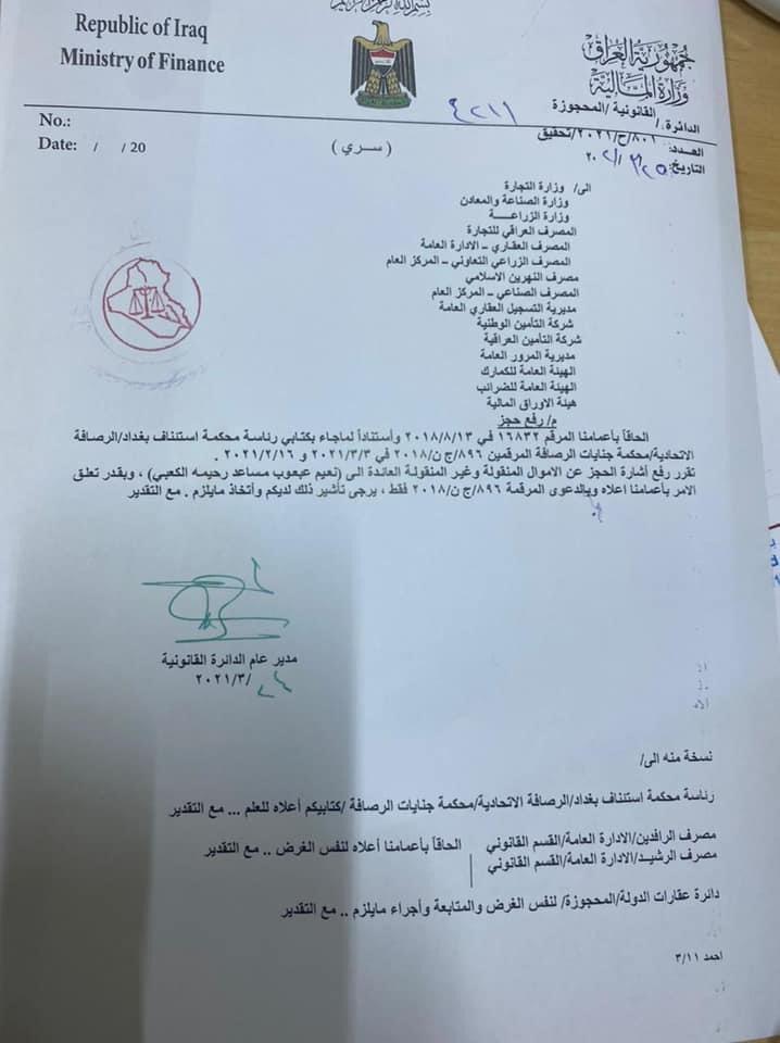 قررت وزارة المالية ، رفع الحجز عن الأموال المنقولة وغير المنقولة العائدة الى أمين بغداد الأسبق نعيم عبعوب ، وذلك استنادا الى قراري محكمة استئناف بغداد /الرصافة الاتحادية ومحكمة جنايات الرصافة