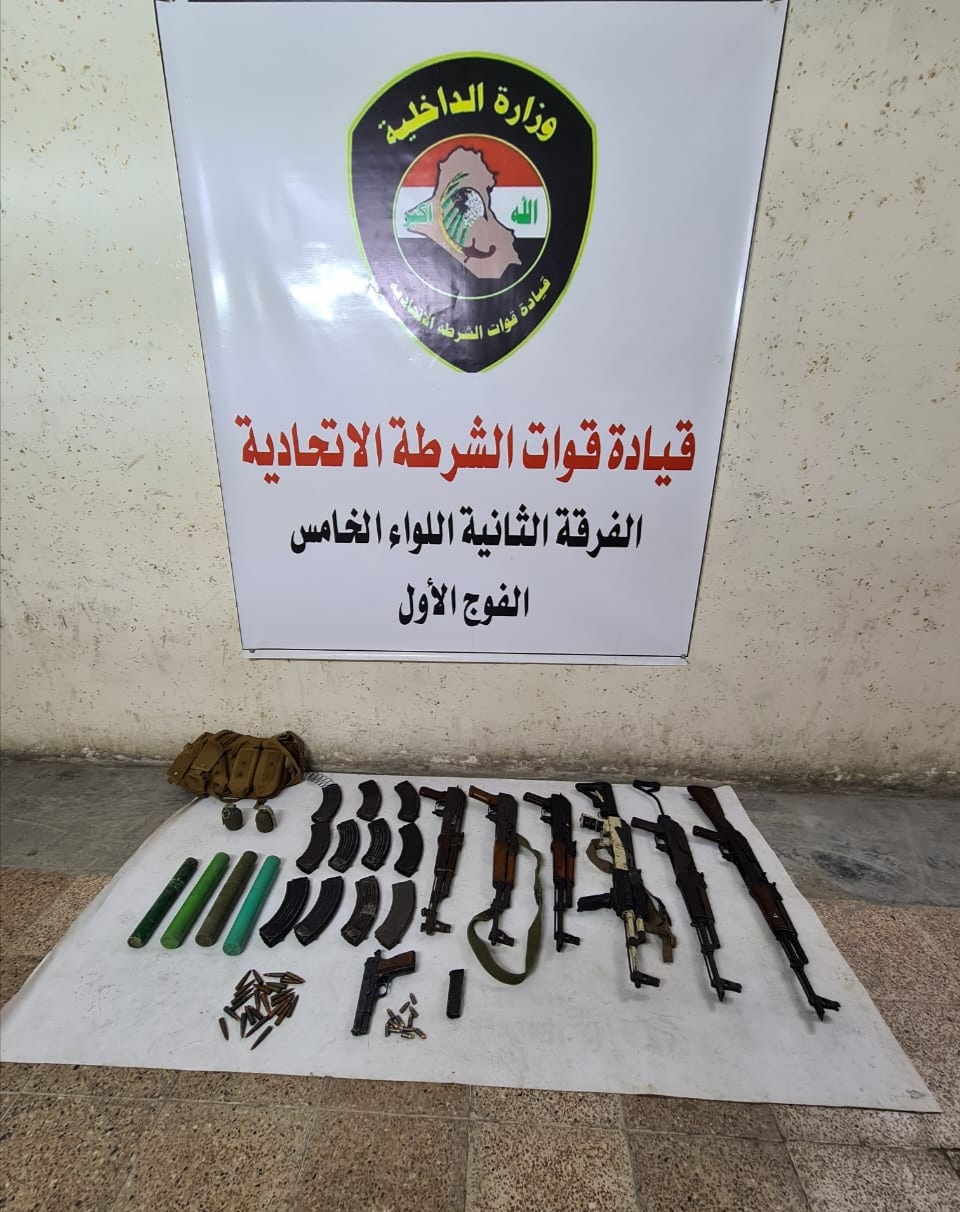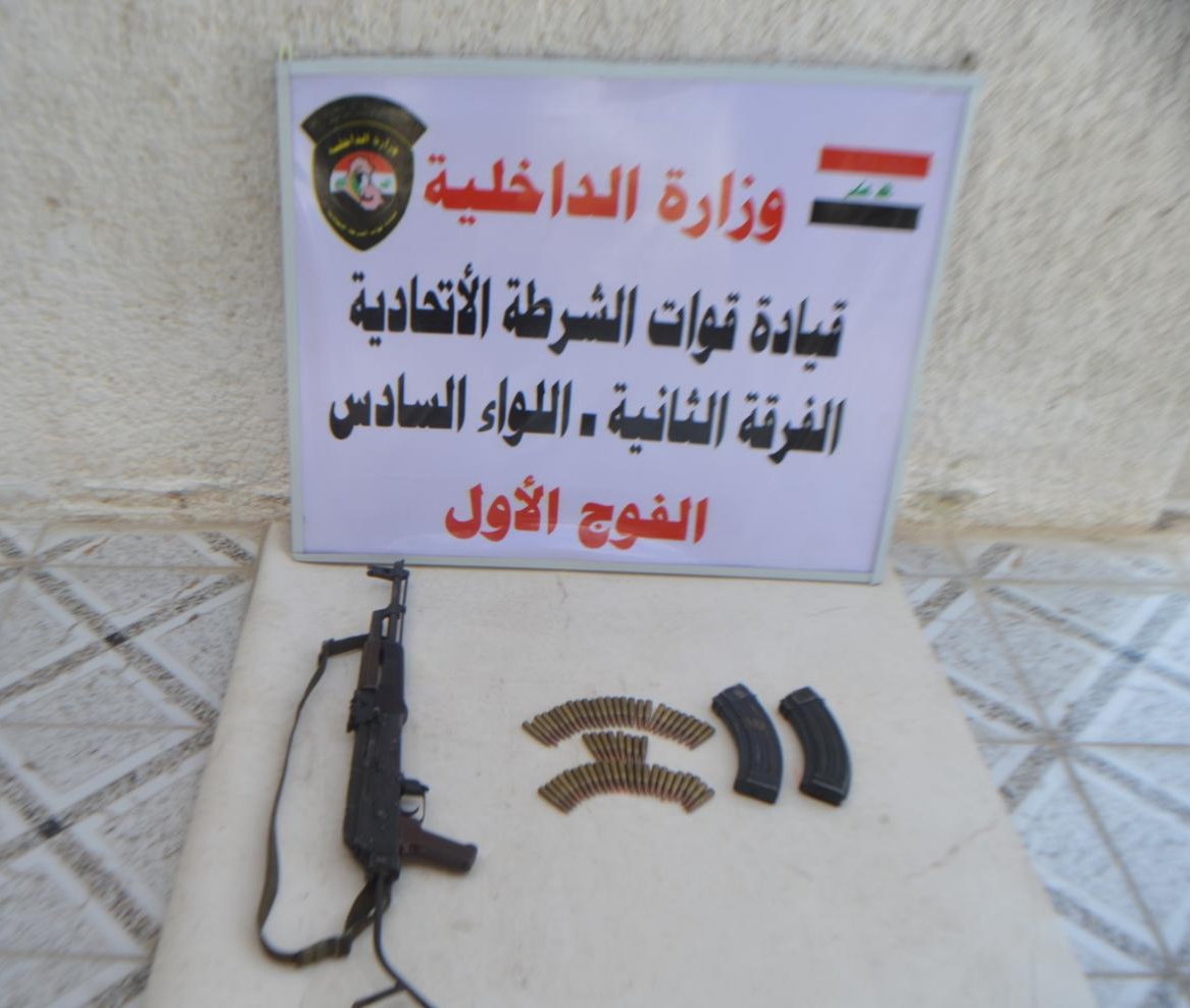 واضافت، كما “نفذت قوة من اللواء السادس الفرقة الثانية شرطة اتحادية عملية تفتيش في منطقة “الشرطة الرابعة” ببغداد تم خلالها العثور على بندقية كلاشنكوف، و مخزني بندقية، و60 إطلاقة بندقية، تم ضبط جميع المواد والتعامل معها اصولياً”.