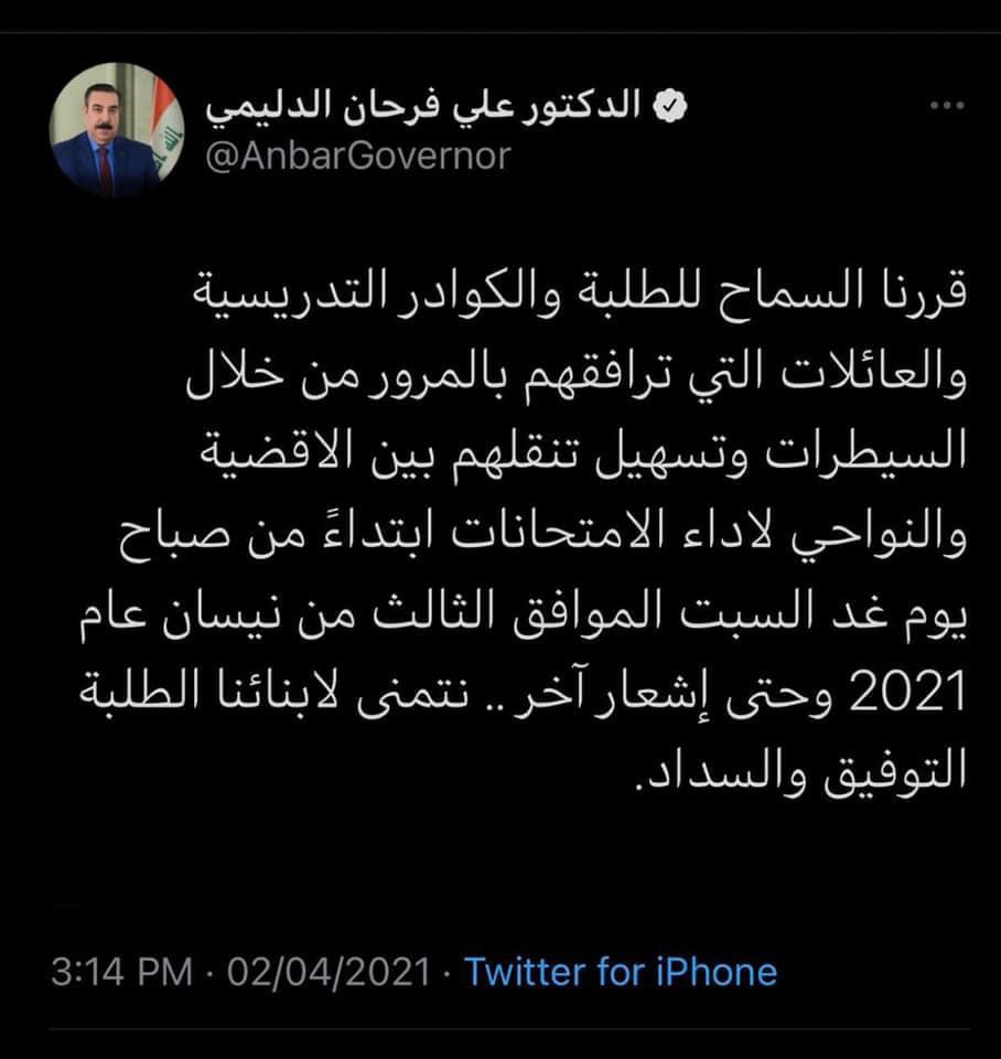 محلياتمحافظ الانبار يعلن تسهيل تنقل الطلبة والكوادر التدريسية ومرافقيهم لاداء الامتحانات قبل 5 سنوات 3 مشاهدات شارك قد يهمك أيضا أمن الأمن الوطني يفكك عصابة ابتزاز إلكتروني ويضبط مئات بطاقات الدفع المزورة في ميسان قبل 21 دقيقة 4 مشاهدات محليات المرور: الحوادث المرورية تعود في أغلبها إلى مخالفات السائقين قبل 59 دقيقة 5 مشاهدات عربي ودولي العراق يُبلغ موسكو برفض تجنيد شبابه في الجيش الروسي قبل ساعة واحدة 6 مشاهدات أقتصاد الجريمة المنظمة تعلن عن اتخاذ إجراءات صارمة على رفع الأسعار مع قرب شهر رمضان قبل ساعة واحدة 6 مشاهدات أقتصاد وزيرة المالية تدعو الجهات كافة إلى إرسال جداول الرواتب قبل ساعتين 7 مشاهدات