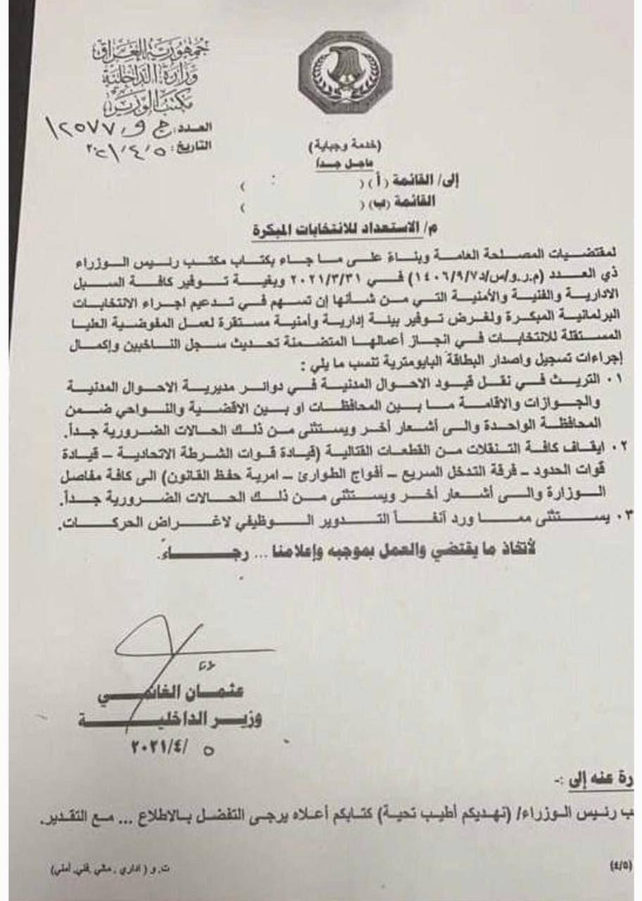 وأظهرت وثيقة صادرة عن مكتب الغانمي، حصلت عليها الرشيد، أن “وزير الداخلية وجه بتسهيل وتوفير كافة السبل الادارية والفنية والأمنية التي من شأنها أن تسهم في تدعيم اجراء الانتخابات البرلمانية المبكرة”.