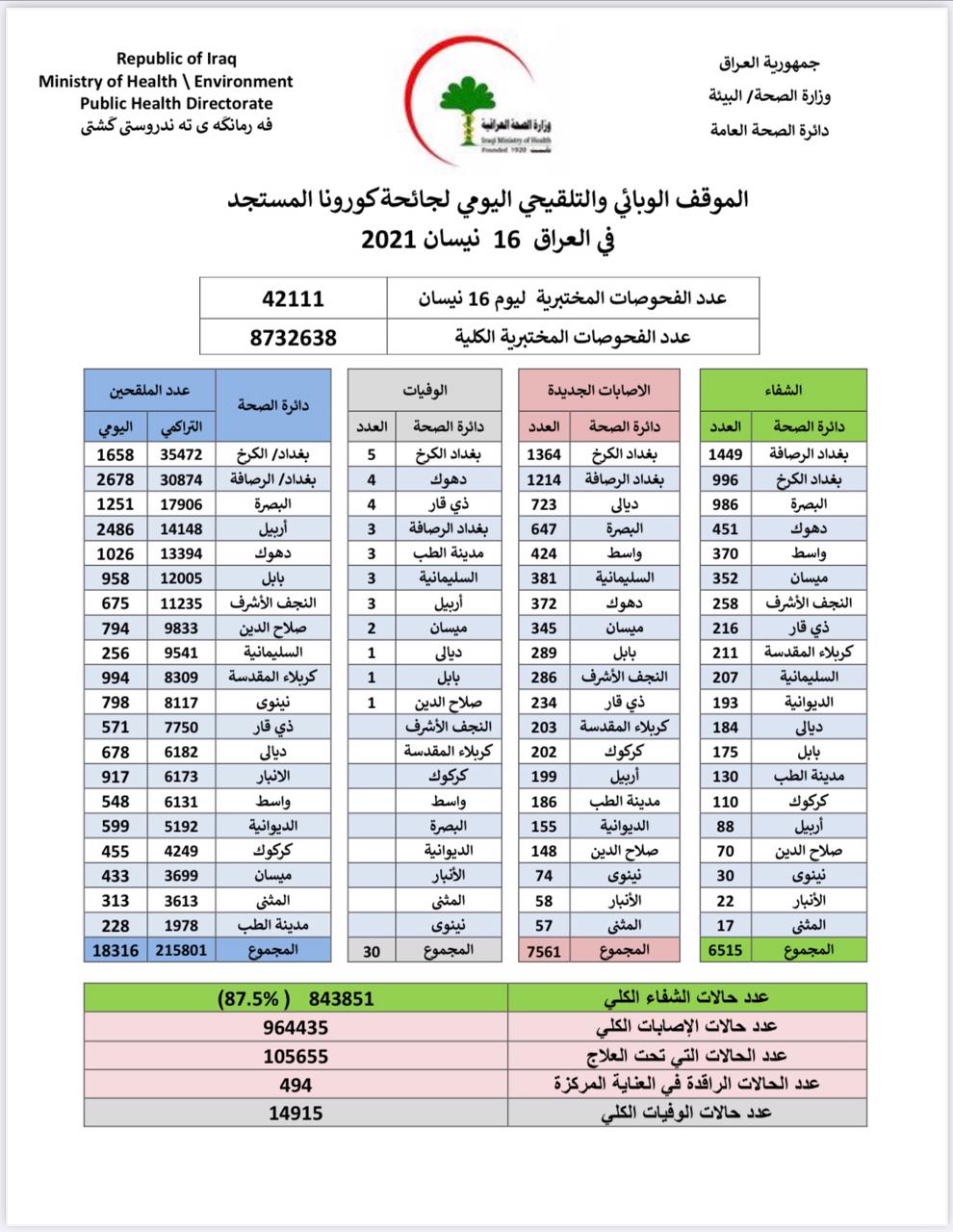 محلياتالصحة تعلن تسجيل 30 وفاة بكورونا و 6515 حالة شفاء من الفيروس قبل 5 سنوات 5 مشاهدات شارك قد يهمك أيضا أمن بالتنسيق مع الجهات السورية.. اعتقال 4 متهمين وضبط اكثر من مليون وسبعمائة ألف حبة مخدرة قبل 9 ساعات 14 مشاهدات سياسة رئيس البرلمان يوجه بالإيعاز إلى الجهات المعنية لإطلاق الرواتب المتوقفة بدون سند قانوني قبل 10 ساعات 17 مشاهدات عربي ودولي ترامب: الحرب مع إيران ستنتهي قريباً جداً قبل 10 ساعات 17 مشاهدات أقتصاد انخفاض اسعار صرف الدولار مع الاغلاق قبل 11 ساعة 18 مشاهدات عربي ودولي بدء محاكمة الرئيس السوري السابق بشار الأسد غيابياً بدمشق قبل 12 ساعة 22 مشاهدات