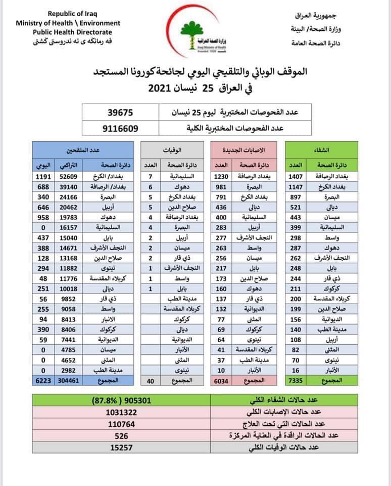 محلياتالصحة تعلن تسجيل 40 وفاة بكورونا و 7335 حالة شفاء من الفيروس قبل 5 سنوات 3 مشاهدات شارك قد يهمك أيضا أمن وزير الداخلية يصل كربلاء لإعداد الخطط التنظيمية الخاصة بزيارة النصف من شعبان قبل 5 دقائق 2 مشاهدات عربي ودولي وزير الخارجية الفرنسي: ندعم وضع الحرس الثوري الإيراني على قائمة المنظمات الإرهابية قبل 14 دقيقة 2 مشاهدات أمن اعتقال متهمين بقضايا مختلفة ومخالفين لشروط الاقامة وضبط اسلحة غير مرخصة في بغداد قبل ساعة واحدة 6 مشاهدات أقتصاد ارتفاع اسعار الذهب الى مستويات قياسية بفعل تصاعد التوترات الجيوسياسية قبل ساعتين 9 مشاهدات محليات الانواء الجوية: أمطار وغبار وارتفاع في درجات الحرارة خلال الايام المقبلة قبل ساعتين 8 مشاهدات