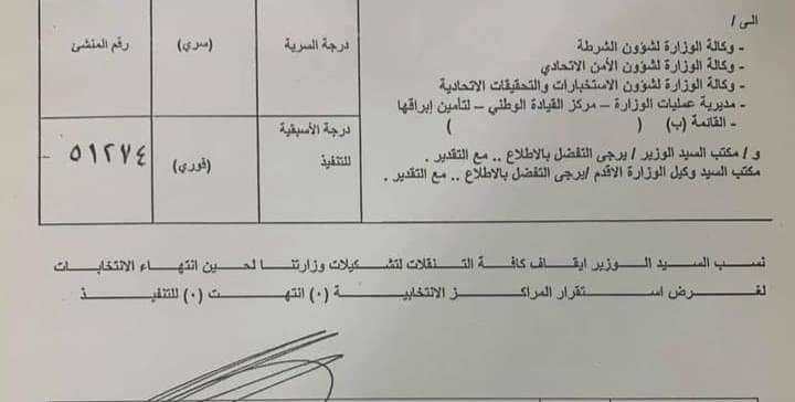 أمنبالوثيقة .. وزير الداخلية يأمر بايقاف كافة التنقلات لتشكيلات الوزارة لحين انتهاء الانتخابات قبل 5 سنوات 9 مشاهدات شارك قد يهمك أيضا أمن اعتقال تاجر دولي بحوزته مادة الحشيشة المخدرة في السليمانية قبل 7 ساعات 8 مشاهدات محليات التربية توجّه بإلغاء الوكالات الخاصة في المعاملات التربوية قبل 7 ساعات 21 مشاهدات محليات توقف مؤقت للحركة الملاحية في مطار اربيل الدولي بسبب الضباب الكثيف قبل 8 ساعات 9 مشاهدات أقتصاد رويترز: العقود الآجلة لخام برنت ترتفع إلى 70.71 دولار للبرميل عند التسوية قبل 8 ساعات 9 مشاهدات أمن الداخلية: اعتقال 175 مخالفاً لشروط الإقامة من الجنسيات العربية والأجنبية في الرصافة قبل 9 ساعات 9 مشاهدات