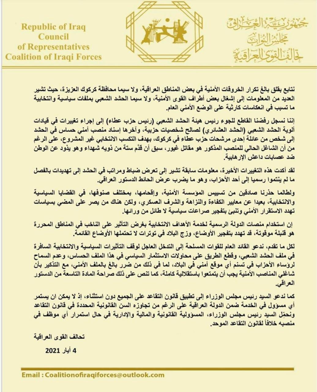 بالوثيقة .. تحالف القوى يطالب الكاظمي بالتدخل لايقاف التأثيرات في ملف الحشد الشعبي