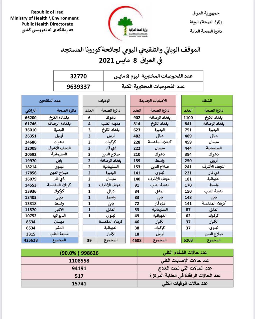 محلياتالصحة تعلن تسجيل 4608 اصابة جديدة بكورونا في عموم العراق قبل 5 سنوات 12 مشاهدات شارك قد يهمك أيضا عربي ودولي ترامب: لا يوجد إطار زمني للحرب في إيران قبل 9 ساعات 9 مشاهدات عربي ودولي البيت الأبيض: ترامب قدم عرضا للنظام الإيراني ويريد ردا موحدا منه قبل 10 ساعات 13 مشاهدات عربي ودولي البيت الأبيض: ترامب لم يضع موعدا محددا لتمديد وقف إطلاق النار مع ايران قبل 10 ساعات 9 مشاهدات عربي ودولي القيادة المركزية الامريكية تنفي التفاف عدة سفن تجارية على الحصار البحري ضد ايران قبل 10 ساعات 12 مشاهدات عربي ودولي القيادة المركزية الامريكية: قواتنا أمرت 29 سفينة بالعودة كجزء من الحصار ضد إيران قبل 10 ساعات 9 مشاهدات