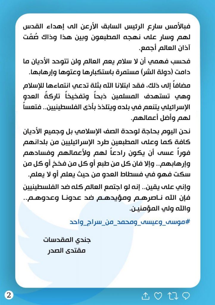 سياسةالصدر: هناك ثلة محسوبة على اليهودية اخذت على عاتقها تفتيت الاديان قبل 5 سنوات 3 مشاهدات شارك قد يهمك أيضا رياضة صفعة مدوية لريال مدريد.. المحكمة تحمي أسرار برشلونة في فضيحة نيجريرا قبل ساعة واحدة 8 مشاهدات عربي ودولي بينها الهول.. سوريا تعلن سعيها لإنهاء مخيمات احتجاز المرتبطين بـ”داعش” قبل ساعتين 5 مشاهدات أمن بسبب خلافات عشائرية.. مقتل رجل خمسيني بـ(11) إطلاقة نارية ضمن قضاء القرنة في البصرة قبل ساعتين 7 مشاهدات عربي ودولي شمخاني: إيران مستعدة لسيناريوهات أوسع والمواجهة لن تقتصر على البحر قبل ساعتين 10 مشاهدات محليات السيد الصدر: من يستخدم الغناء والطرب والموسيقى محتجاً بإحياء ذكر أهل البيت فهو عاصٍ وينبغي مقاطعته قبل 3 ساعات 13 مشاهدات