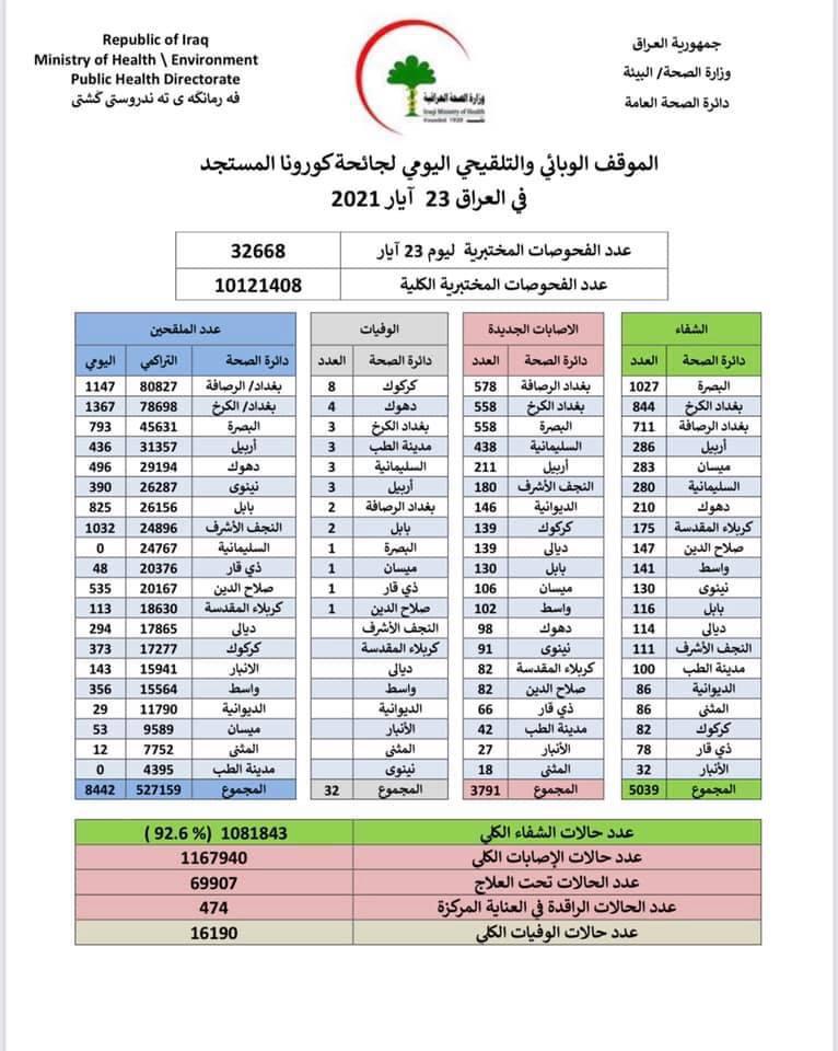 محلياتالصحة تعلن تسجيل 32 وفاة بكورونا و 5039 حالة شفاء من الفيروس قبل 5 سنوات 5 مشاهدات شارك قد يهمك أيضا عربي ودولي وزير خارجية ايران: انتهاك وقف اطلاق النار من قبل واشنطن يعيق استمرار المسار الدبلوماسي قبل ساعة واحدة 8 مشاهدات سياسة الإطار التنسيقي يؤجل حسم مرشح رئاسة الحكومة إلى الأربعاء المقبل قبل ساعتين 9 مشاهدات سياسة رئيس الجمهورية يسلم “محمد سمعان” مرسوم تعيينه محافظاً لكركوك قبل 3 ساعات 10 مشاهدات عربي ودولي ترامب: الاتفاق مع إيران سيضمن السلام والأمن لإسرائيل والشرق الأوسط وسائر العالم قبل 3 ساعات 9 مشاهدات سياسة الاطار التنسيقي يعقد اجتماعه في منزل الحكيم لحسم ملف رئاسة الوزراء قبل 4 ساعات 11 مشاهدات