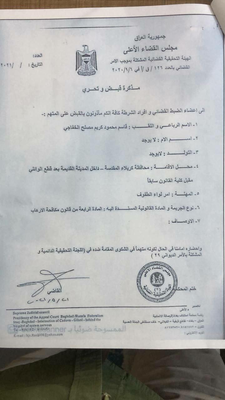 أمنبالوثيقة .. القضاء يصدر مذكرة قبض بحق قاسم مصلح الخفاجي قبل 5 سنوات 72 مشاهدات شارك قد يهمك أيضا سياسة وزير الخارجية: المبعوث الامريكي “توماس باراك” هو المعني بملف العراق حاليًا قبل 13 دقيقة 3 مشاهدات سياسة وزير الخارجية: مارك سافايا لم يعد مبعوث الرئيس الامريكي الى العراق قبل 14 دقيقة 3 مشاهدات عربي ودولي البيت الأبيض: ترامب لا يزال منفتحًا على حل دبلوماسي مع إيران وتصريحاته الاخيرة ليست مناورة قبل 53 دقيقة 8 مشاهدات أخبار منوعة مصر تقرر حجب لعبة “روبلوكس” نهائيًا في البلاد قبل 59 دقيقة 9 مشاهدات عربي ودولي ترامب: نأمل التوصل إلى اتفاق مع إيران قبل ساعة واحدة 8 مشاهدات