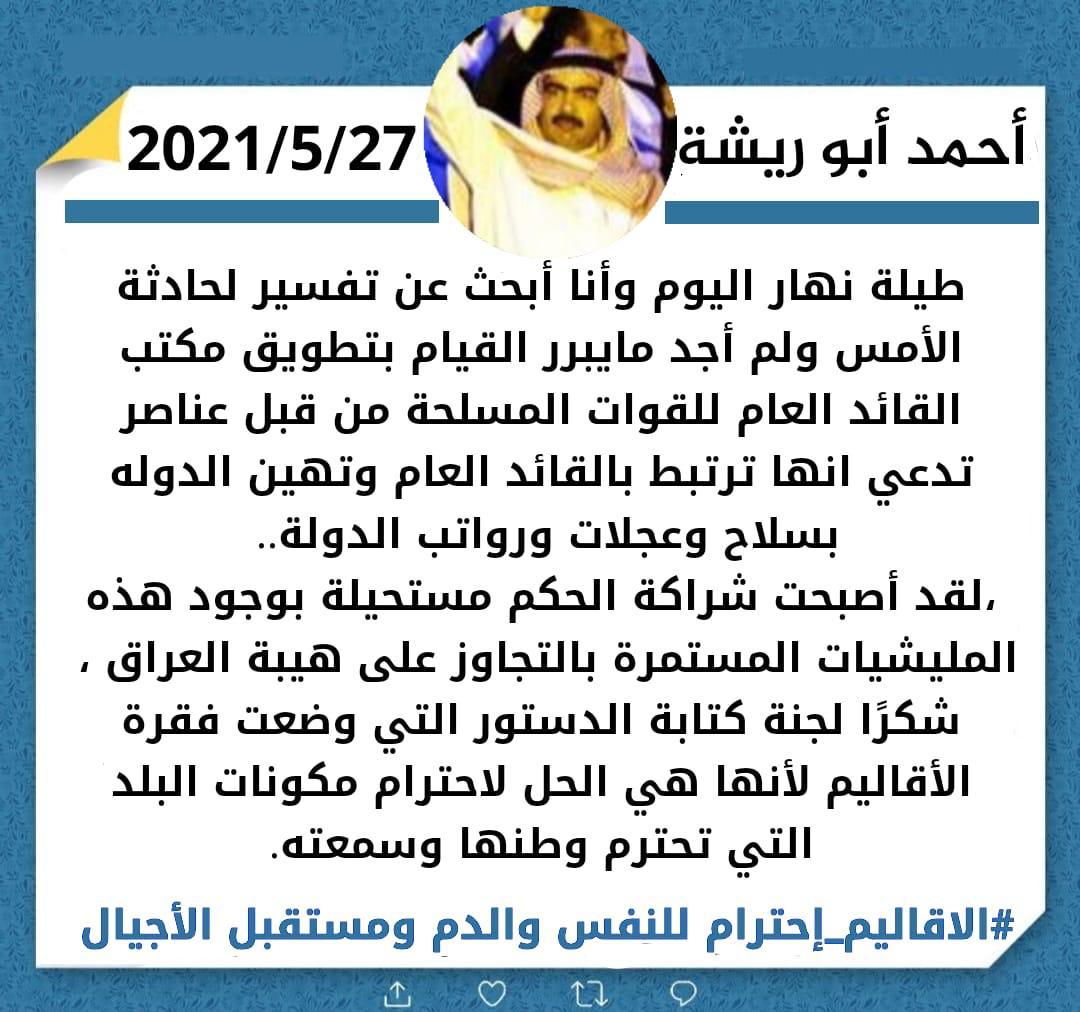 سياسةالشيخ ابو ريشة: شراكة الحكم اصبحت مستحيلة بوجود مليشيات مستمرة بالتجاوز على هيبة الدولة قبل 5 سنوات 1 مشاهدة شارك قد يهمك أيضا الحكم الرابع جماهير الزوراء تفتح النار وتكشف المستور والجوية يحلقون بالصدارة قبل 5 ساعات 8 مشاهدات عربي ودولي قضية استغلال القاصرات.. ترامب: وثائق “إبستين” تبرئني عكس توقعات اليسار الراديكالي قبل 6 ساعات 13 مشاهدات مع ياسر عامر المياحي يقلب الطاولة على حكومة الخدمات! قبل 6 ساعات 11 مشاهدات سياسة وزير الخارجية: المبعوث الامريكي “توماس باراك” هو المعني بملف العراق حاليًا قبل 7 ساعات 12 مشاهدات الاخبار العاجلة وزير الخارجية: مارك سافايا لم يعد مبعوث الرئيس الامريكي الى العراق قبل 7 ساعات 21 مشاهدات