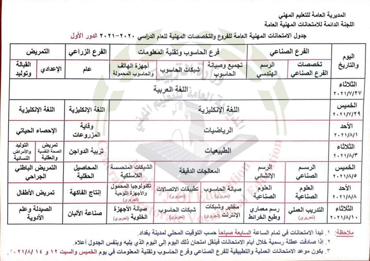 وأضافت، أن “الامتحانات تبدأ في تمام الساعة السابعة صباحاً حسب التوقيت المحلي لمدينة بغداد، اما في حال وجود عطلة رسمية خلال أيام الامتحانات فينتقل امتحان ذلك اليوم الى اليوم الذي يليه وبنفس الجدول، على ان يكون موعد الامتحانات العملية والتطبيقية للفرع الصناعي وفرع الحاسوب وتقنية المعلومات في يوم الخميس والسبت 12 و 14 / 8 / 2021”.