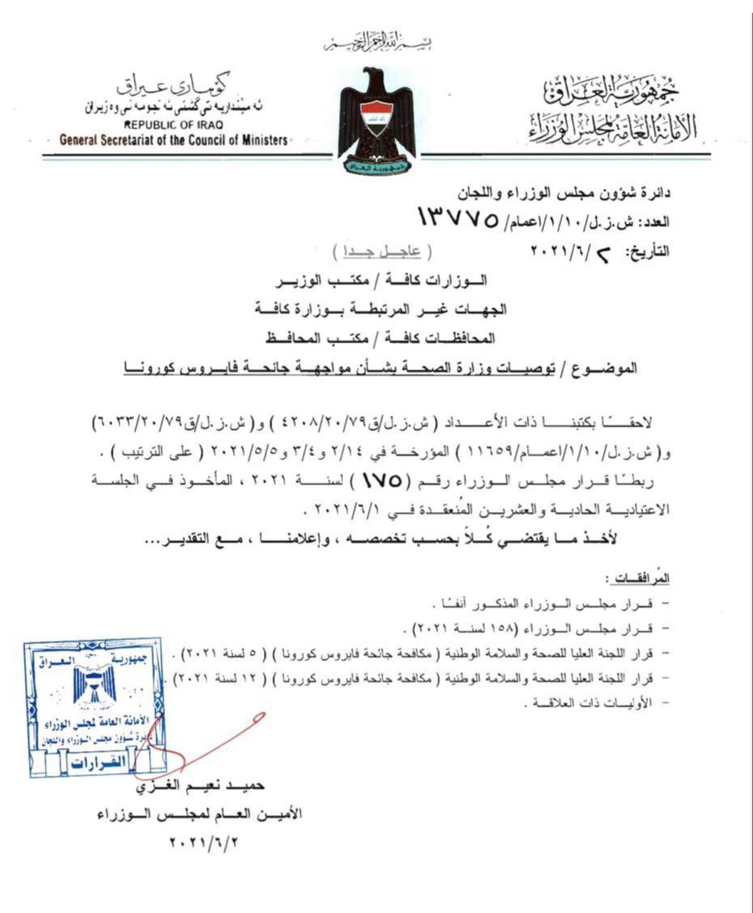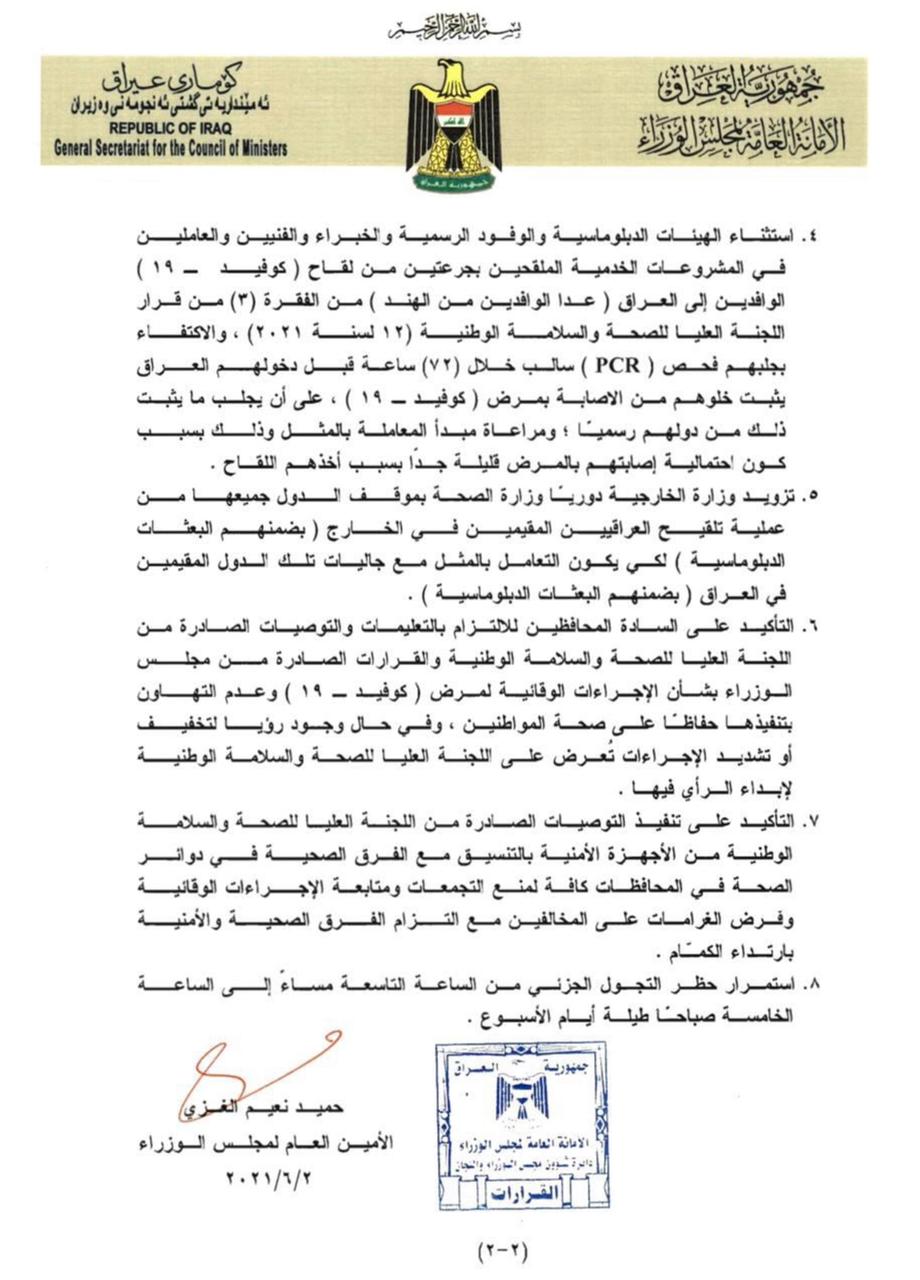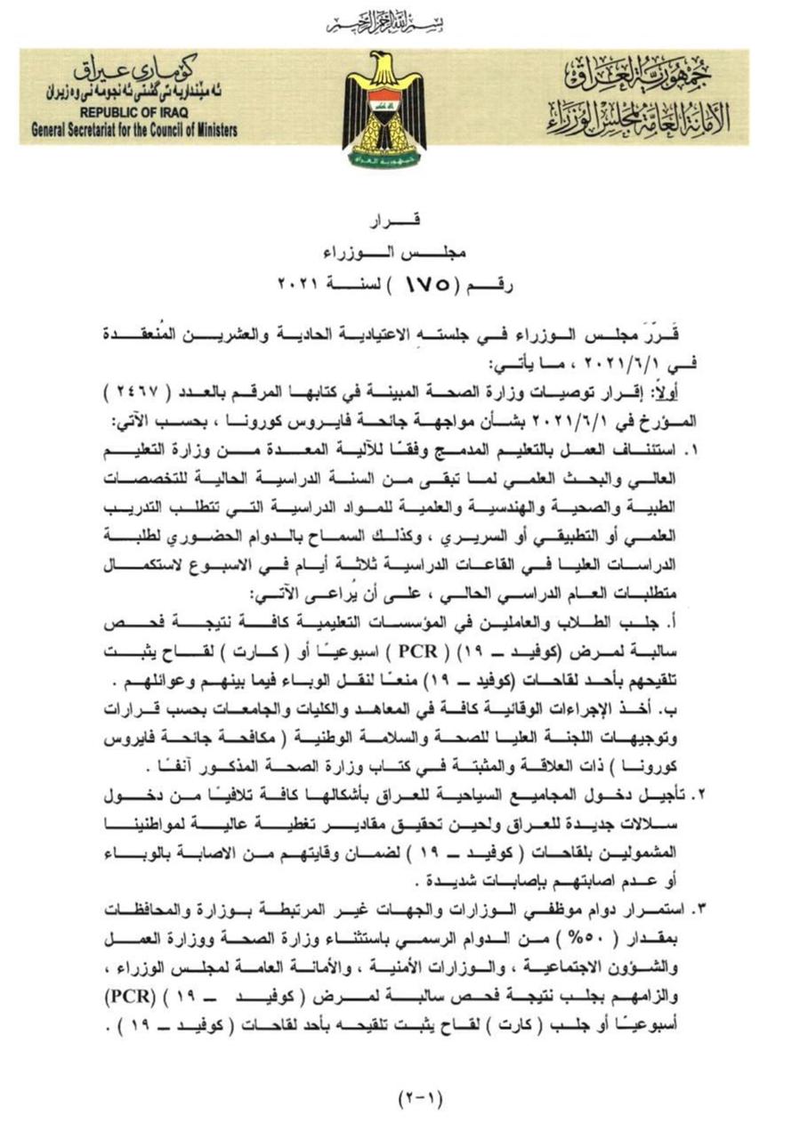 وأقر مجلس الوزراء أيضاً توصية الصحة باستمرار دوام موظفي الوزارات والجهات غير المرتبطة بوزارة والمحافظات بمقدار (50%) من الدوام الرسمي باستثناء وزارة الصحة ووزارة العمل والشؤون الاجتماعية، والوزارات الأمنية، والأمانة العامة لمجلس الوزراء، والزامهم بجلب نتيجة فحص سالبة لمرض كوفيد – 19، (PCR) أسبوعيا أو جلب ( کارت ) لقاح يثبت تلقيحه بأحد لقاحات كورونا.