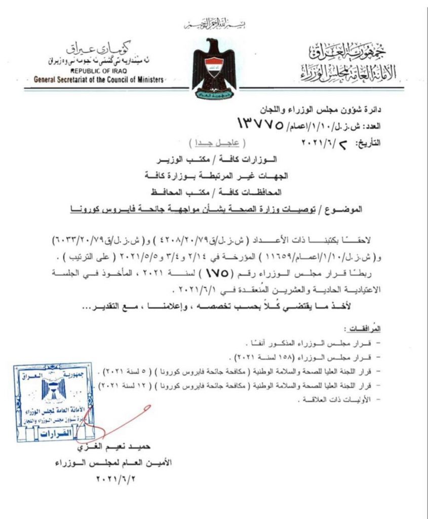 وجاء في وثائق موقعة من امين عام المجلس نعيم الغزي إن “مجلس الوزراء أقر في جلسته الاعتيادية الحادية والعشرين المنعقدة في 2 حزيران الحالي، توصيات وزارة الصحة بشأن مواجهة جائحة فايروس كورونا.