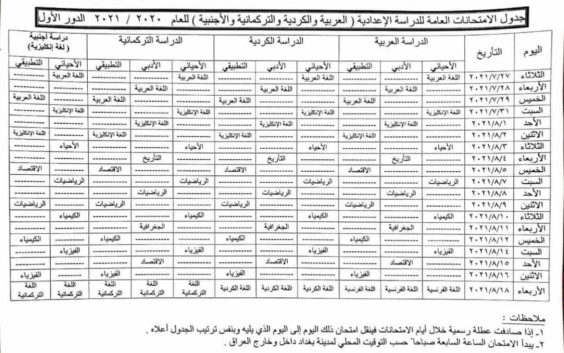 اعلنت وزارة التربية، اليوم الخميس، الجدول الخاص بالامتحانات الوزارية للسادس الاعدادي بكافة فروعه وللعام الدراسي 2020 – 2021 "الدور الأول" .
