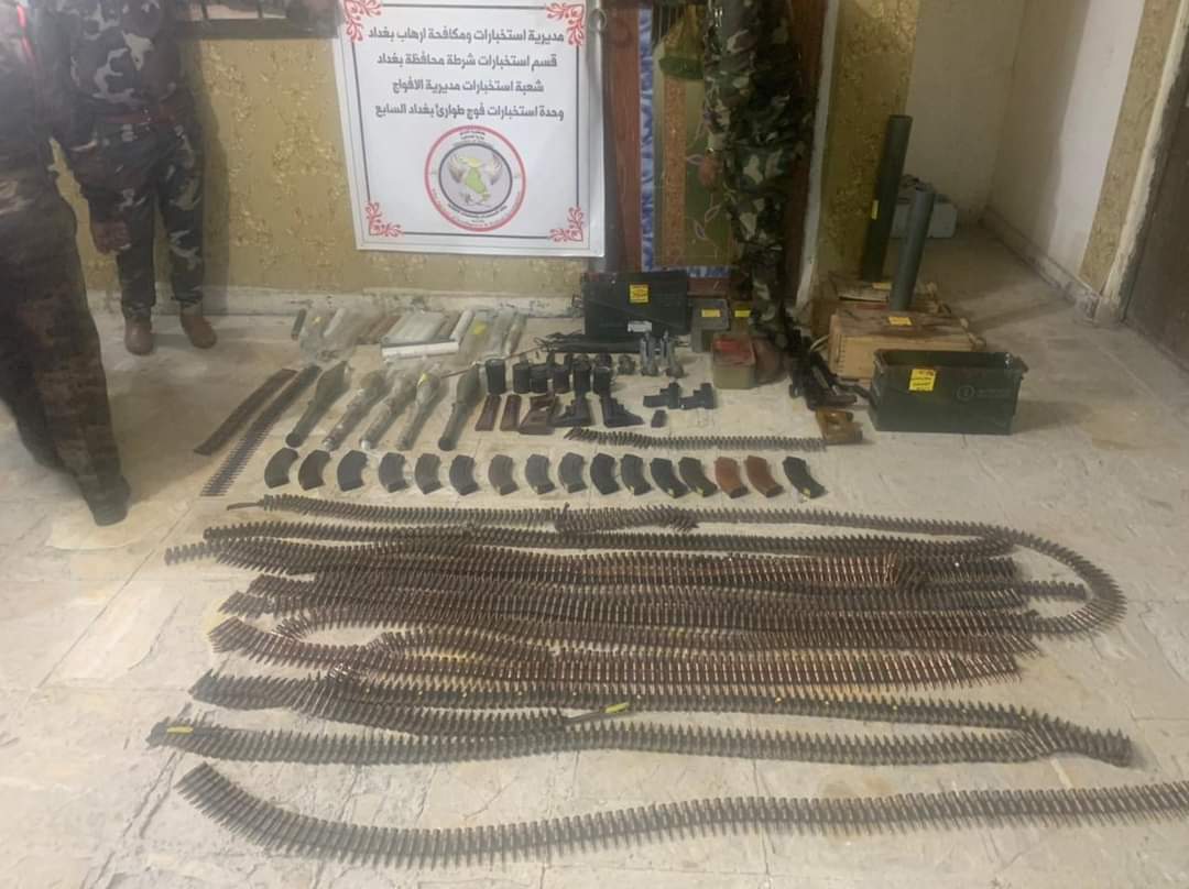 وقالت القيادة، في بيان تلقته الرشيد، انه “على ضوء معلومات استخبارية دقيقة، وبالتنسيق مع قسم استخبارات عمليات بغداد تم ضبط كدس للأسلحة والأعتدة غربي العاصمة، إذ تمكنت قوة مشتركة من فوج طوارئ بغداد السابع واللواء السادس في الفرقة الثانية شرطة اتحادية من ضبط كدس للأسلحة والاعتدة ضم: سلاح BKC مع سبطانة، وخمسة صواريخ قاذفة RBJ7 مع (14) حشوة، ثلاث حاويات عتاد سلاح BKC تحتوي على 19٤٠ اطلاقة، و(16) مخزن سلاح كلاشنكوف، ومسدسين صوتيين، و(10) رمانات مختلفة، وثلاث حربات عسكرية، في منطقة شاخة 6 غربي بغداد”.