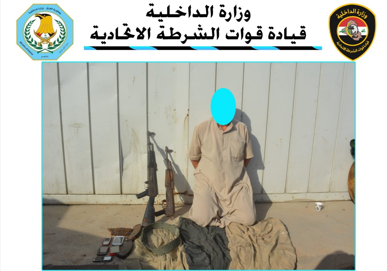 وتابعت، كما “تمكنت قوة من اللواء الآلي الثالث الفرقة الآلية شرطة اتحادية بالاشتراك مع استخبارات اللواء من القاء القبض على الارهابي (غ، م، ص) في عملية مباغتة رصدت تواجده في قرية(ابو كعوبة) بناحية الرياض بمحافظة كركوك، وبحوزته بندقيتين كلاشنكوف مع مخزني بندقية، وملابس عسكرية، و5 موبايلات”.