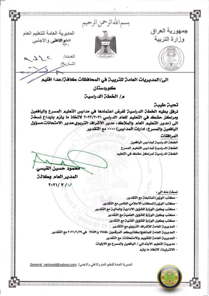 وقالت الوزارة، في بيان تلقته الرشيد، انها أصدرت كتابًا يتضمن خطة الدراسة في مدارس (التعليم المسرع واليافعين ومراكز حقك في التعليم) للعام الدراسي 2021 – 2022 ، حيث تتركز الخطة على تعدد مصادر التعلم مع الأخذ بنظر الاعتبار الإجراءات الاحترازية التي تكفل الحفاظ على الصحة العامة للطلاب دون التأثير على المنهج المقرر” .