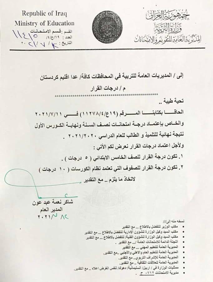 وذكرت الوزارة، في بيان تلقته الرشيد، ان “درجة القرار هي 5 درجات للصف الخامس الابتدائي و10 درجات للصفوف التي تعتمد نظام الكورسات”.