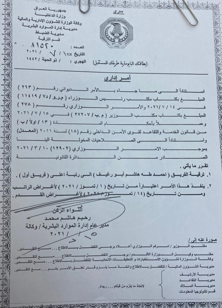 أمنبالوثيقة .. الداخلية تصدر أمراً بترقية الفريق احمد طه ابو رغيف الى رتبة فريق أول قبل 5 سنوات 55 مشاهدات شارك قد يهمك أيضا أمن الدفاع: نمتلك منظومات إنذار مبكر لمواجهة التحديات الجوية قبل 4 دقائق 2 مشاهدات محليات حركة العجلات شبه متوقفة.. اختناقات مرورية تضرب أغلب مناطق بغداد قبل 10 دقائق 2 مشاهدات أمن مصدر: القوات الأمنية رفعت اللافتات الخاصة بارتفاع التعرفة الكمركية لعدم وجود موافقات أصولية قبل 27 دقيقة 6 مشاهدات رياضة أولى صفقات ريال مدريد في الموسم الجديد قبل 29 دقيقة 5 مشاهدات أمن الاستخبارات العسكرية تحبط تهريب مواد إلى كركوك قبل 52 دقيقة 5 مشاهدات