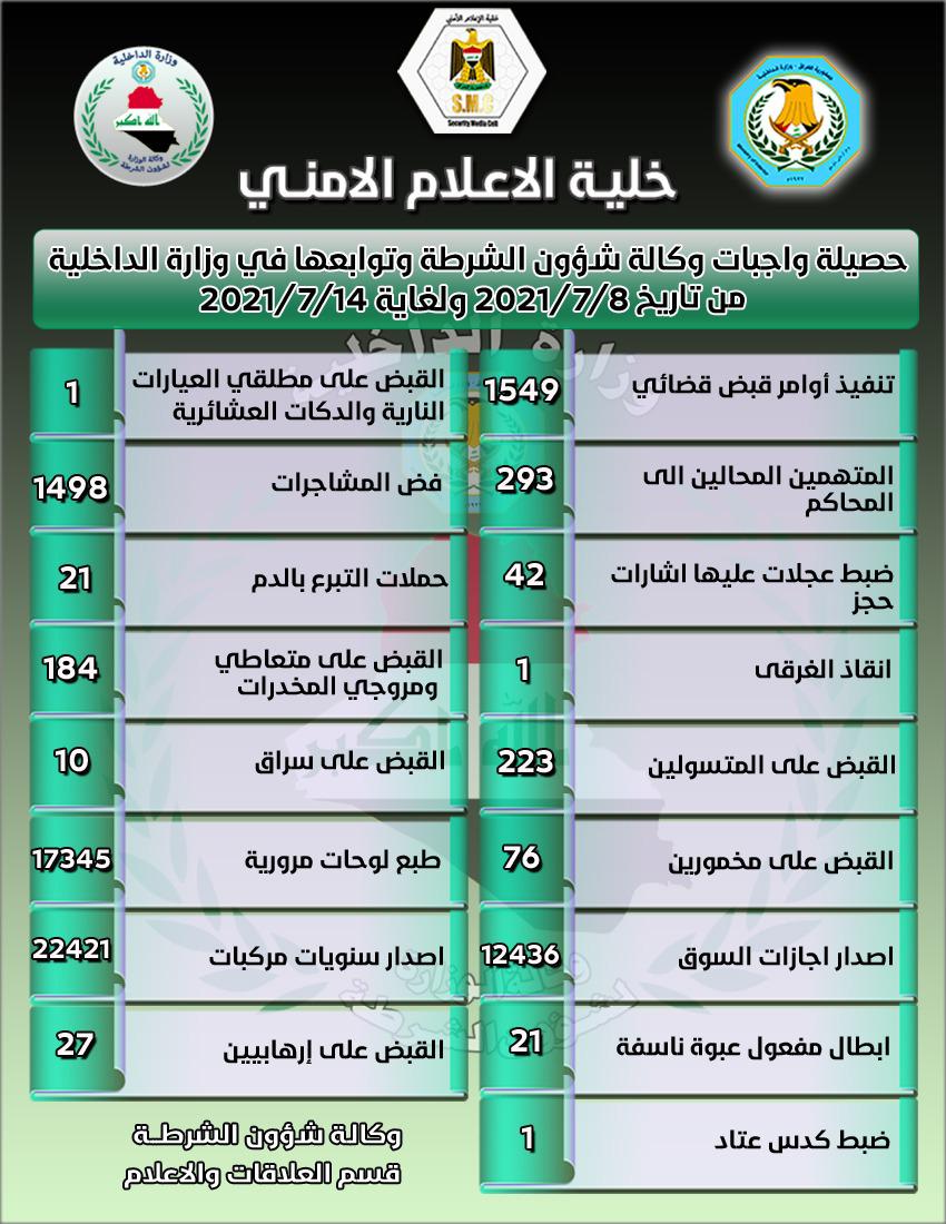 حصيلة واجبات وكالة شؤون الشرطة وتوابعها في وزارة الداخلية من تاريخ 2021/7/8 ولغاية 2021/7/14: