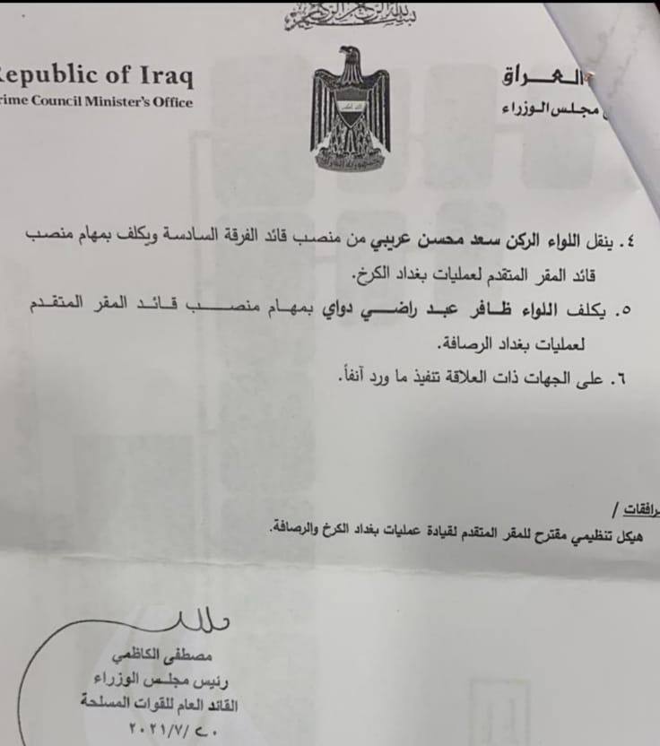 أمنبالوثيقة .. الكاظمي يكلف قائدين جديدين لعمليات الكرخ والرصافة قبل 5 سنوات 17 مشاهدات شارك قد يهمك أيضا أمن فصائل المقاومة تعلن تنفيذ 19 عملية ضد القواعد الامريكية في العراق والمنطقة قبل 8 دقائق 8 مشاهدات أمن رئيس مجلس النواب هيبت الحلبوسي يزور موقع حادث العامرية في بغداد قبل 9 دقائق 4 مشاهدات سياسة الكويت تدين اقتحام قنصليتها في البصرة وتعده خرقًا لالتزامات العراق الدولية قبل 44 دقيقة 8 مشاهدات أمن اصابة ضابط و4 منتسبين بقصف جوي طال نقطة امنية مشتركة شمالي بغداد قبل 54 دقيقة 8 مشاهدات أمن اصابة شخصين إثر سقوط مقذوف على أحد المنازل في منطقة العامرية غربي بغداد قبل ساعة واحدة 11 مشاهدات