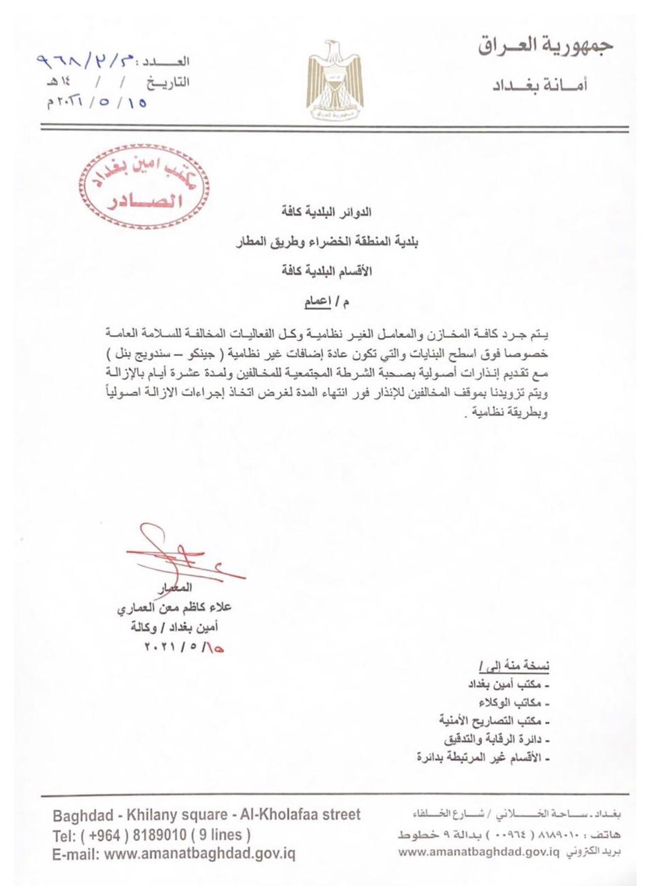 محلياتبالوثيقة .. امانة بغداد تتوعد المخالفين لشروط السلامة من المخازن والمعامل باجراءات قانونية قبل 5 سنوات 6 مشاهدات شارك قد يهمك أيضا عربي ودولي على رأسها ملف ايران.. البيت الابيض يكشف تفاصيل زيارة نتنياهو الى الولايات المتحدة الاربعاء قبل ساعتين 8 مشاهدات عربي ودولي الحكم بالسجن 3 سنوات وخمسة اشهر على أمريكي هدد بقتل ترامب عبر “تيك توك” قبل 3 ساعات 8 مشاهدات الحكم الرابع قوقية يخطف الانظار.. زعيم الوطن يضرب الوصل بثلاثية قبل 3 ساعات 8 مشاهدات عربي ودولي رويترز: أقمار صناعية تظهر إعداد الولايات المتحدة منصات صواريخ متنقلة بقاعدة العُديد في قطر قبل 4 ساعات 10 مشاهدات عربي ودولي ترامب: أتوقع عقد الجولة الثانية من المحادثات مع إيران الأسبوع المقبل قبل 5 ساعات 9 مشاهدات