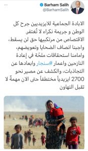 سياسةرئيس الجمهورية: الابادة الجماعية للايزيديين جريمة لا تُغتفر والاقتصاص من مرتكبيها حق لن يسقط قبل 5 سنوات 7 مشاهدات شارك قد يهمك أيضا عربي ودولي على رأسها ملف ايران.. البيت الابيض يكشف تفاصيل زيارة نتنياهو الى الولايات المتحدة الاربعاء قبل 4 ساعات 9 مشاهدات عربي ودولي الحكم بالسجن 3 سنوات وخمسة اشهر على أمريكي هدد بقتل ترامب عبر “تيك توك” قبل 5 ساعات 10 مشاهدات الحكم الرابع قوقية يخطف الانظار.. زعيم الوطن يضرب الوصل بثلاثية قبل 5 ساعات 9 مشاهدات عربي ودولي رويترز: أقمار صناعية تظهر إعداد الولايات المتحدة منصات صواريخ متنقلة بقاعدة العُديد في قطر قبل 6 ساعات 13 مشاهدات عربي ودولي ترامب: أتوقع عقد الجولة الثانية من المحادثات مع إيران الأسبوع المقبل قبل 6 ساعات 11 مشاهدات