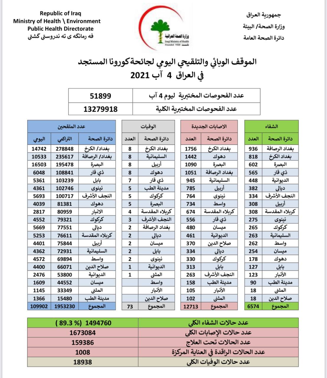 أعلنت وزارة الصحة، اليوم الثلاثاء، الموقف الوبائي اليومي لجائحة كورونا في عموم العراق.