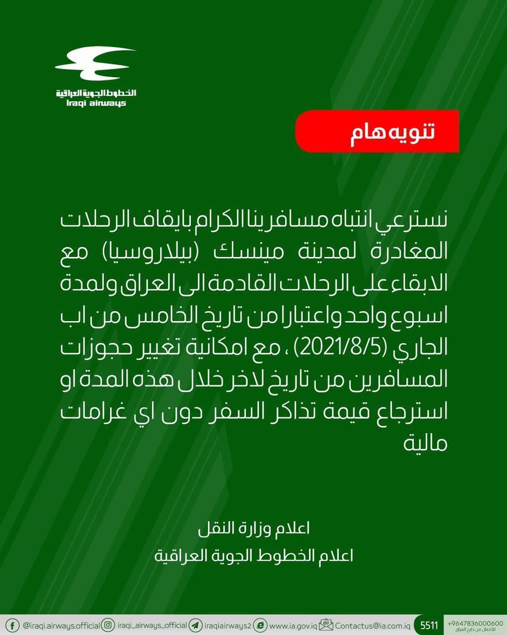 محلياتالخطوط الجوية تصدر بياناً بشأن ايقاف الرحلات الى بيلاروسيا قبل 5 سنوات 2 مشاهدات شارك قد يهمك أيضا سياسة وزير الخارجية المصري يصل بغداد قبل 40 دقيقة 11 مشاهدات عربي ودولي مجتبى خامنئي: إيران لا تسعى لحرب لكنها لن تتنازل عن حقوقها قبل 41 دقيقة 5 مشاهدات سياسة البرلمان يعلن عقد جلسة انتخاب رئيس الجمهورية السبت المقبل قبل 41 دقيقة 7 مشاهدات عربي ودولي ترامب: متفائل بأن اتفاق سلام مع إيران بات قريبًا قبل 55 دقيقة 7 مشاهدات عربي ودولي الصحة اللبنانية: 303 شهداء و1150 مصابا حصيلة غير نهائية للغارات الإسرائيلية أمس قبل ساعة واحدة 5 مشاهدات