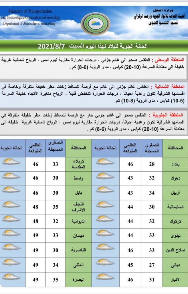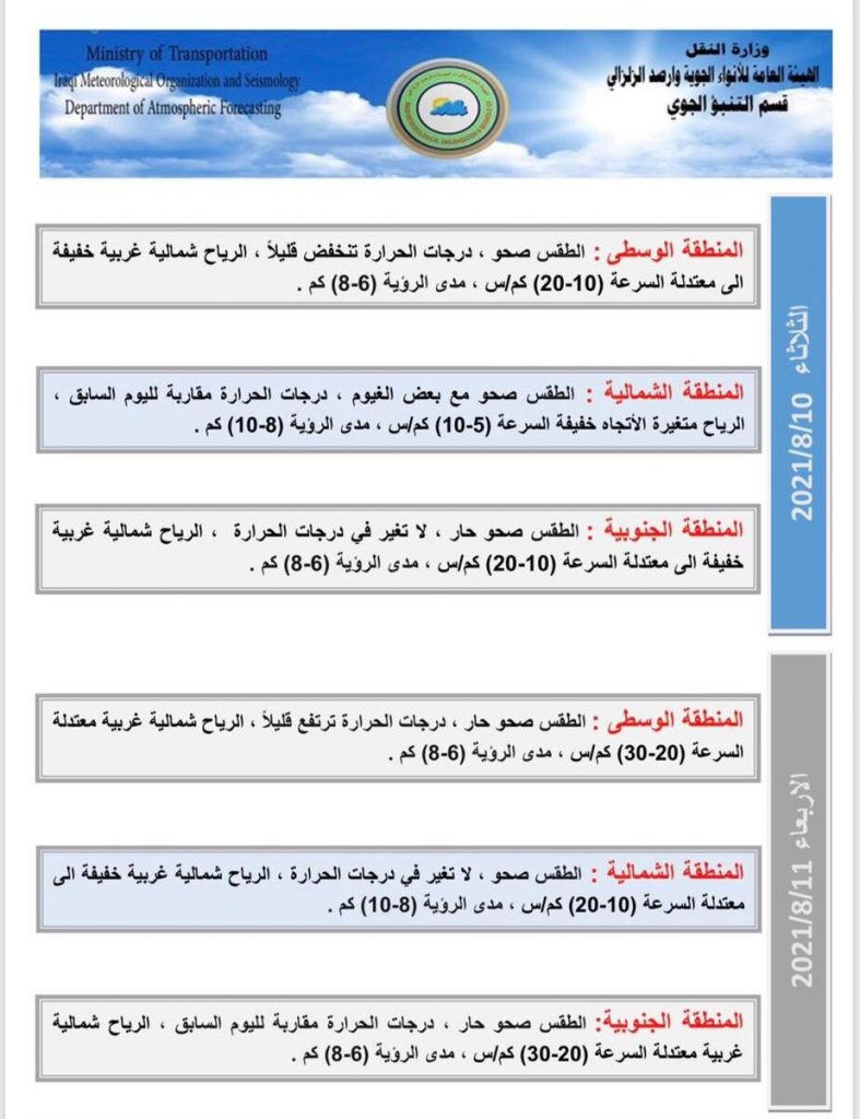 محلياتالحالة الجوية ودرجات الحرارة في العراق اليوم السبت والايام الاربعة المقبلة قبل 5 سنوات 2 مشاهدات شارك الطقس قد يهمك أيضا أقتصاد ارتفاع اسعار صرف الدولار مع الاغلاق قبل 19 دقيقة 4 مشاهدات سياسة المالكي: الحشد الشعبي مؤسسة رسمية والحديث عن حله أو دمجه يتم حصراً ضمن الدستور قبل 36 دقيقة 9 مشاهدات عربي ودولي لاريجاني: سلطنة عُمان تؤدي دورًا محوريًا في تسهيل الحوار الإيراني-الأمريكي قبل 39 دقيقة 8 مشاهدات عربي ودولي البرلمان الأوروبي يوافق على قرض بـ 90 مليار يورو لأوكرانيا قبل 55 دقيقة 6 مشاهدات عربي ودولي لافروف: سنتخذ تدابير مضادة في حال عسكرة غرينلاند قبل 58 دقيقة 8 مشاهدات