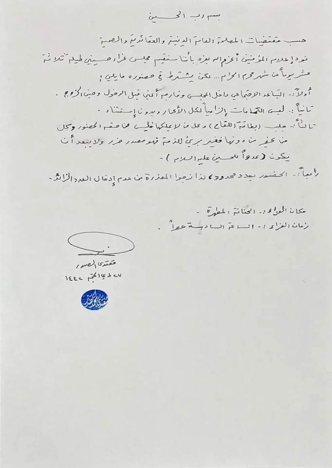 وقال الصدر، بحسب وثيقة حصلت عليها الرشيد، انه “بحسب مقتضيات المصلحة العامة الدينية والعقائدية والصحية، نود إعلام الاخوة المؤمنين أعزهم الله بعزه بأننا سنقيم مجلس عزاء حسيني طيلة ثلاثة عشر يوماً من شهر محرم الحرام”.