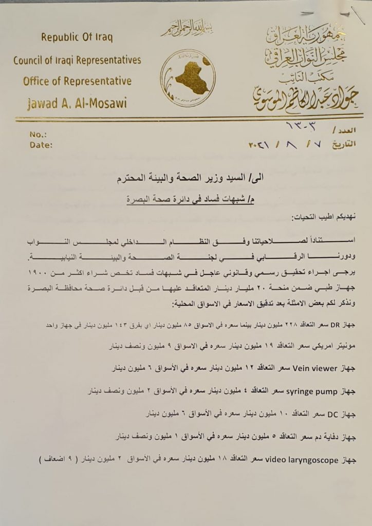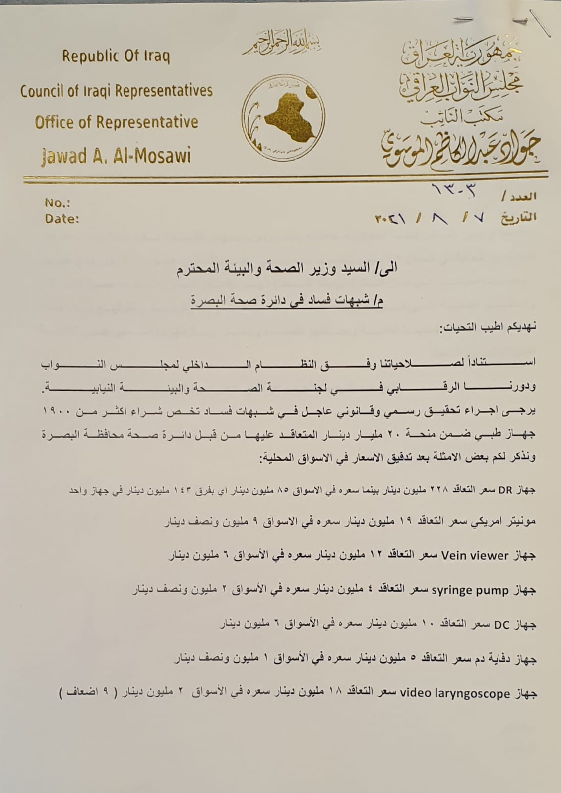 وذكر الموسوي، بحسب وثيقة صادرة عن مكتبه الاعلامي، حصلت عليها الرشيد، ان “هناك شبهات فساد تخص شراء اكثر من 1900 جهاز طبي ضمن منحة 20 مليار دينار المتعاقد عليها من قبل دائرة صحة البصرة”.