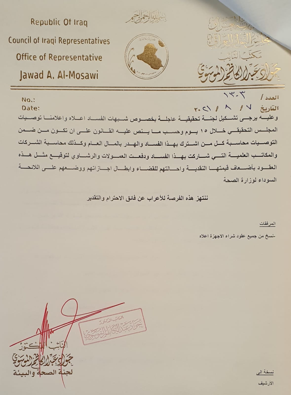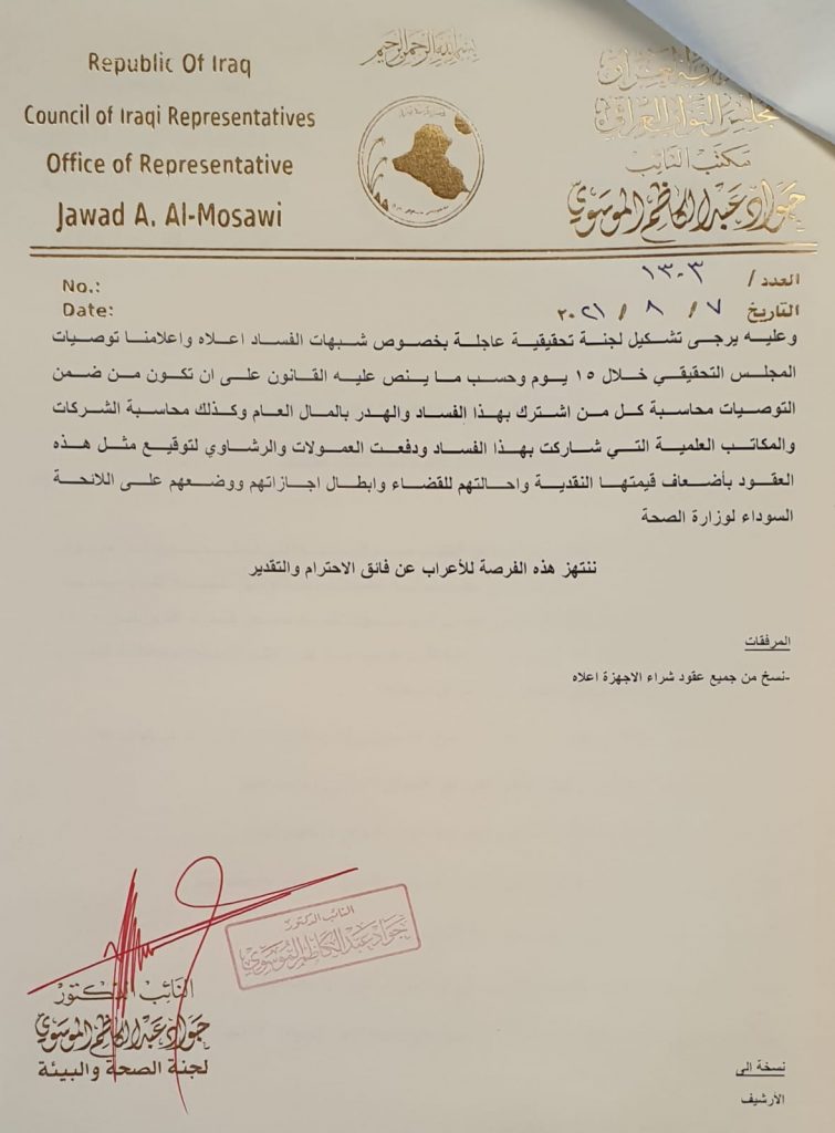 وطالب الموسوي، وزارة الصحة “باجراء تحقيق قانوني رسمي وعاجل من قبل لجنة مختصة واعلان توصيات المجلس التحقيقي خلال مدة 15 يوماً وعدم التأخير او التسويف في محاسبة الفاسدين”.