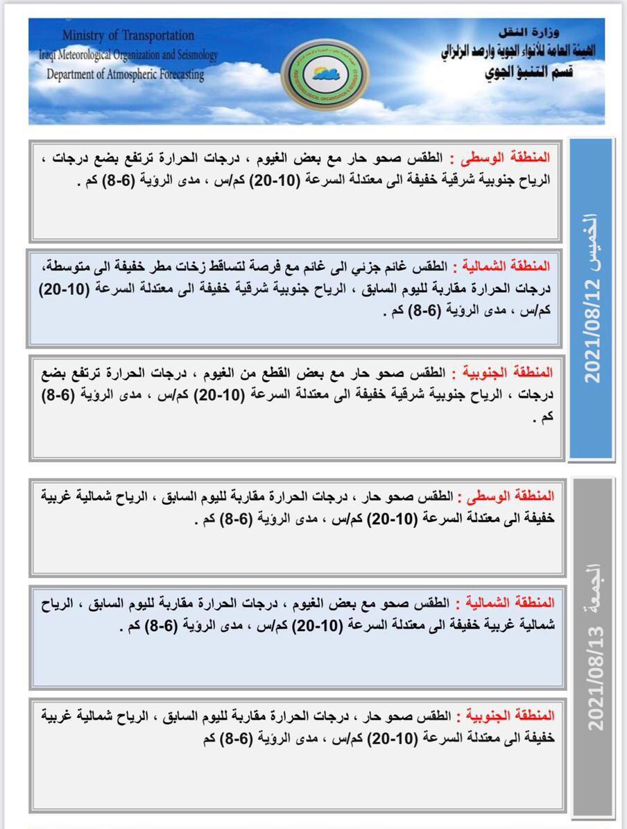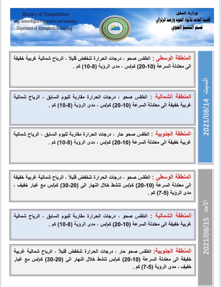 وأضافت، أن “الطقس ليوم الجمعة سيكون صحواً حاراً ودرجات الحرارة مقاربة لليوم السابق، فيما ستكون الرياح شمالية غربية ، خفيفة الى معتدلة السرعة (10-20 )كم /س ومدى الرؤية سيكون (8-10)كم /س”، موضحة أن “درجات الحرارة ليوم السبت المقبل ستشهد انخفاضاً قليلاً، والرياح شمالية غربية خفيفة الى معتدلة السرعة (10-20 )كم /س ،ومدى الرؤية سيكون (8-10)كم /س”.