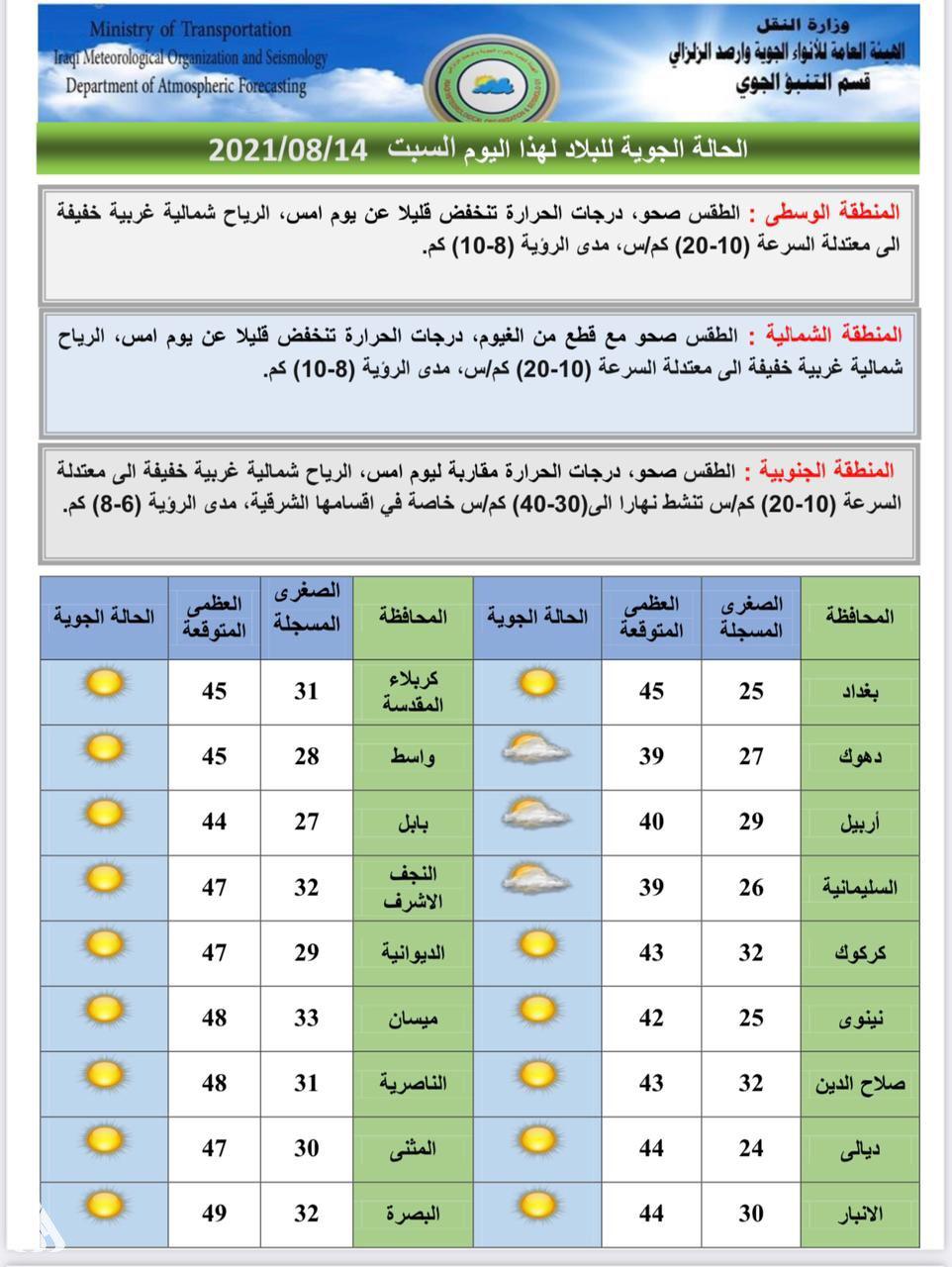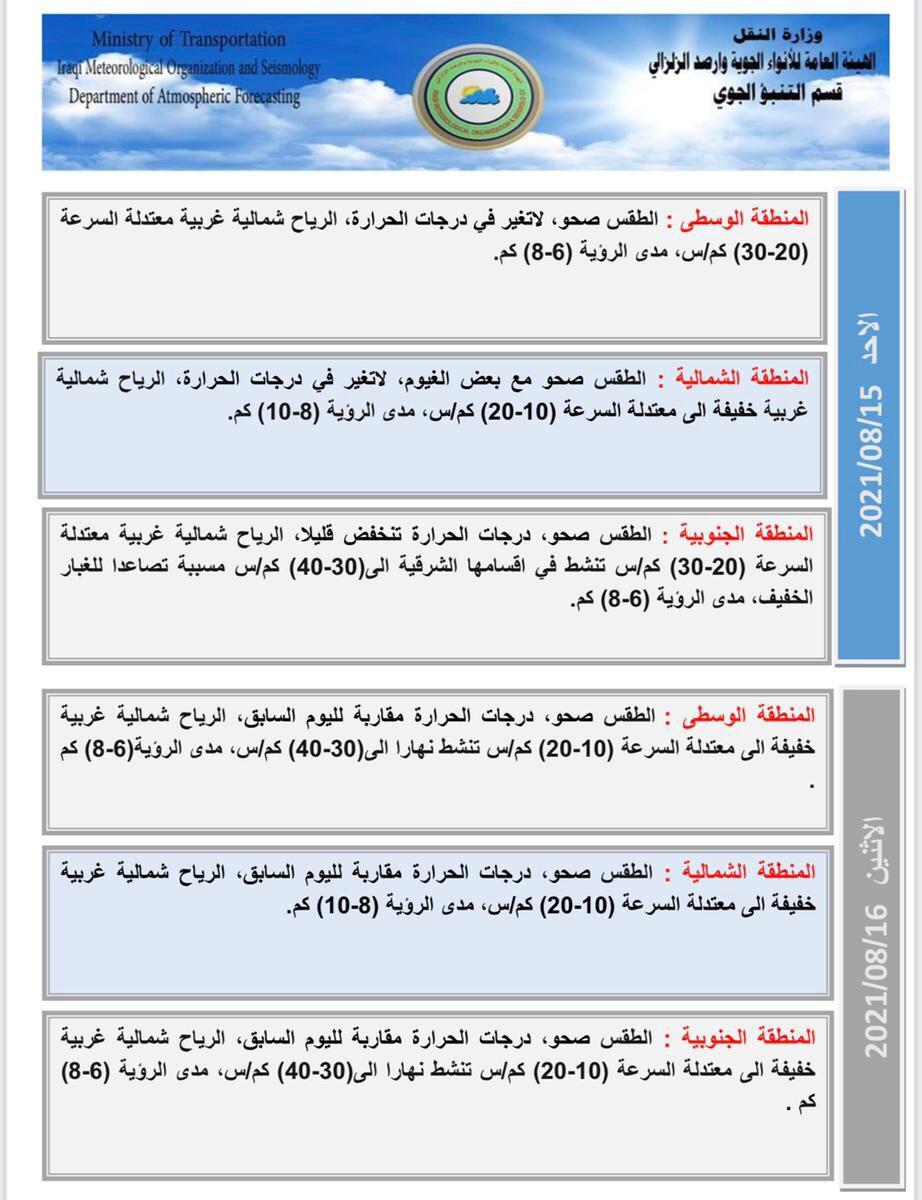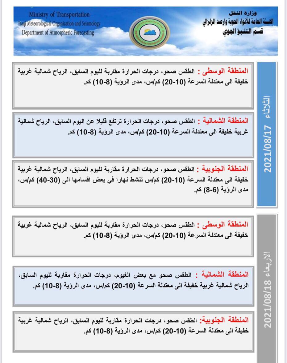 ولفت البيان، إلى أن "يوم الثلاثاء القادم سيكون الطقس في المنطقة الشمالية صحواً، ودرجات الحرارة ترتفع قليلا، والرياح شمالية غربية خفيفة الى معتدلة السرعة (10-20) كم/س ، ومدى الرؤية (8-10) کم، أما المنطقة الجنوبية فالطقس فيها سيكون صحواً، ولا تغير في درجات الحرارة، والرياح شمالية غربية خفيفة إلى معتدلة السرعة (10-20) کم/س ، ومدى الرؤية (6-8) کم، بينما سيكون الطقس في المنطقة الوسطى صحواً ،ولا تغير في درجات الحرارة والرياح شمالية غربية خفيفة إلى معتدلة السرعة (10- 20) كم/س، ومدى الرؤية (8- 10 )كم".